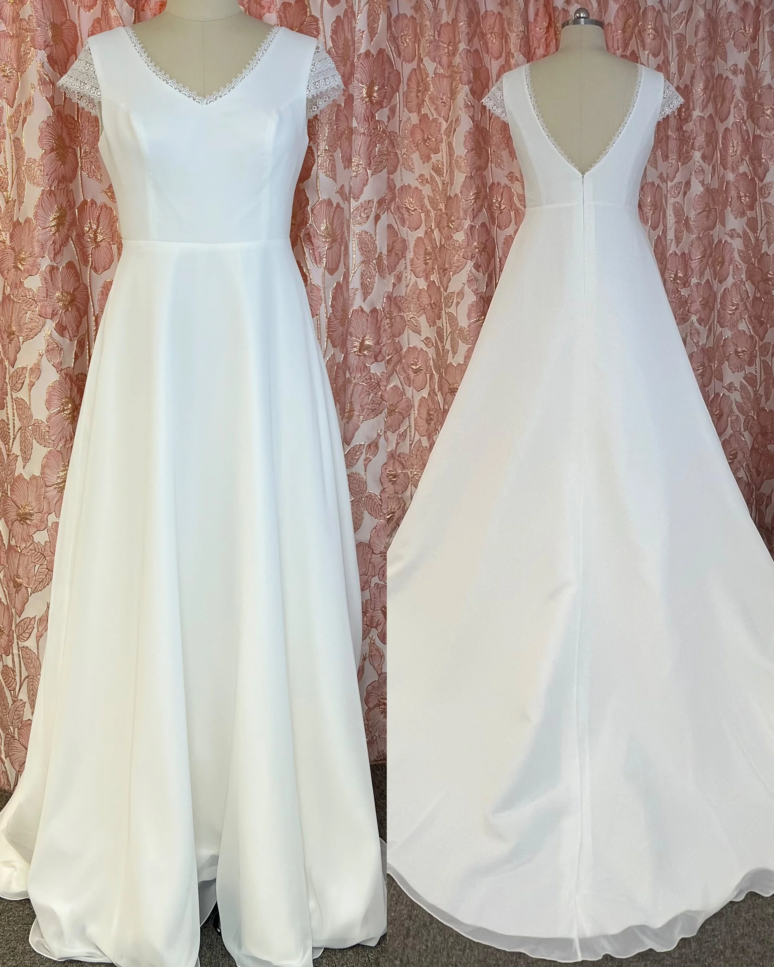 Klassinen A-linjainen kreppipuku näyttävällä laahuksella. Sävy ivory