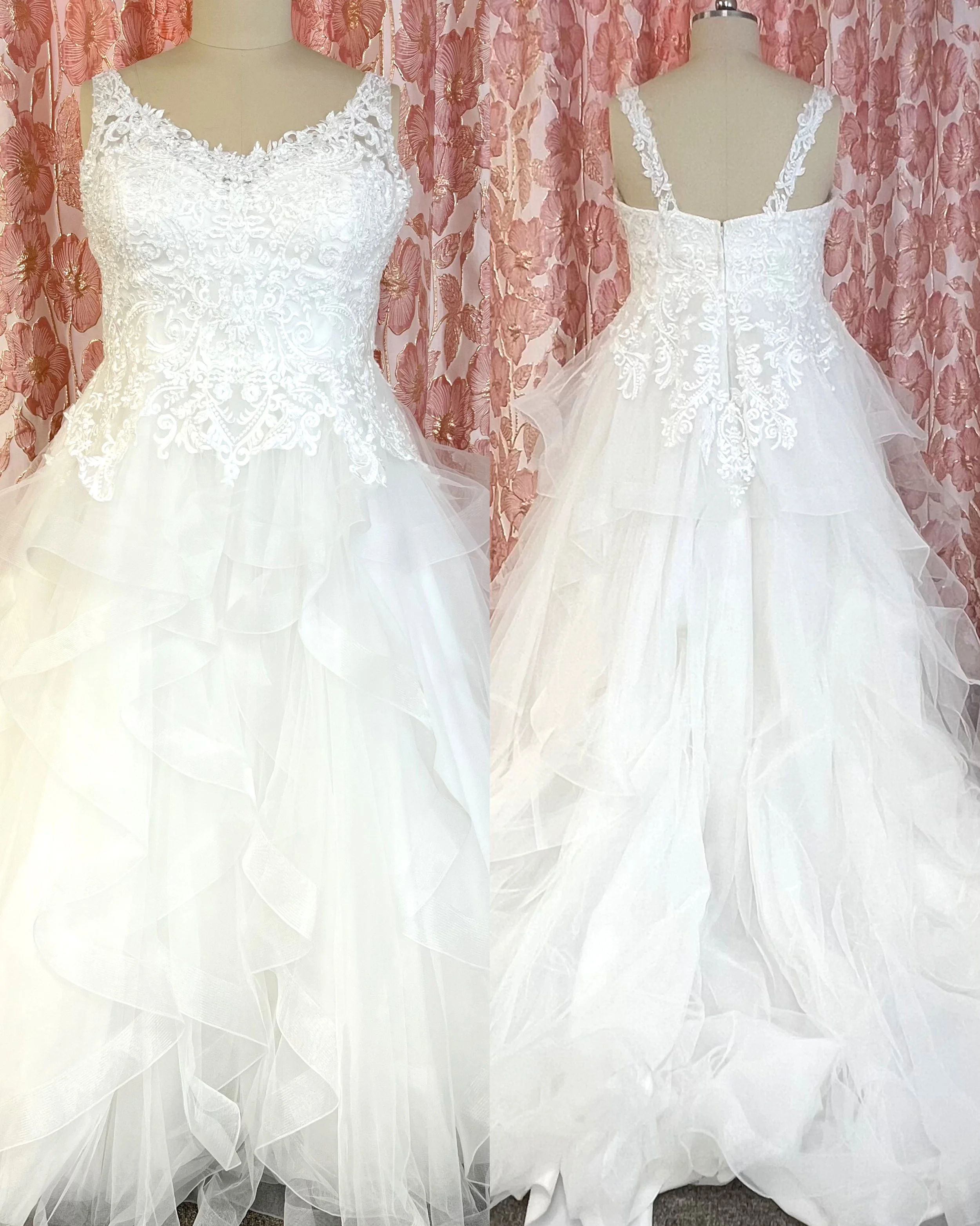 A-linjainen puku tyllihelmalla, jossa on useita kerroksia. Pitsiyläosa on kirjailtu paljetein ja helmin. Puvun mukana tulee alushame ja pukupussi. Sävy ivory