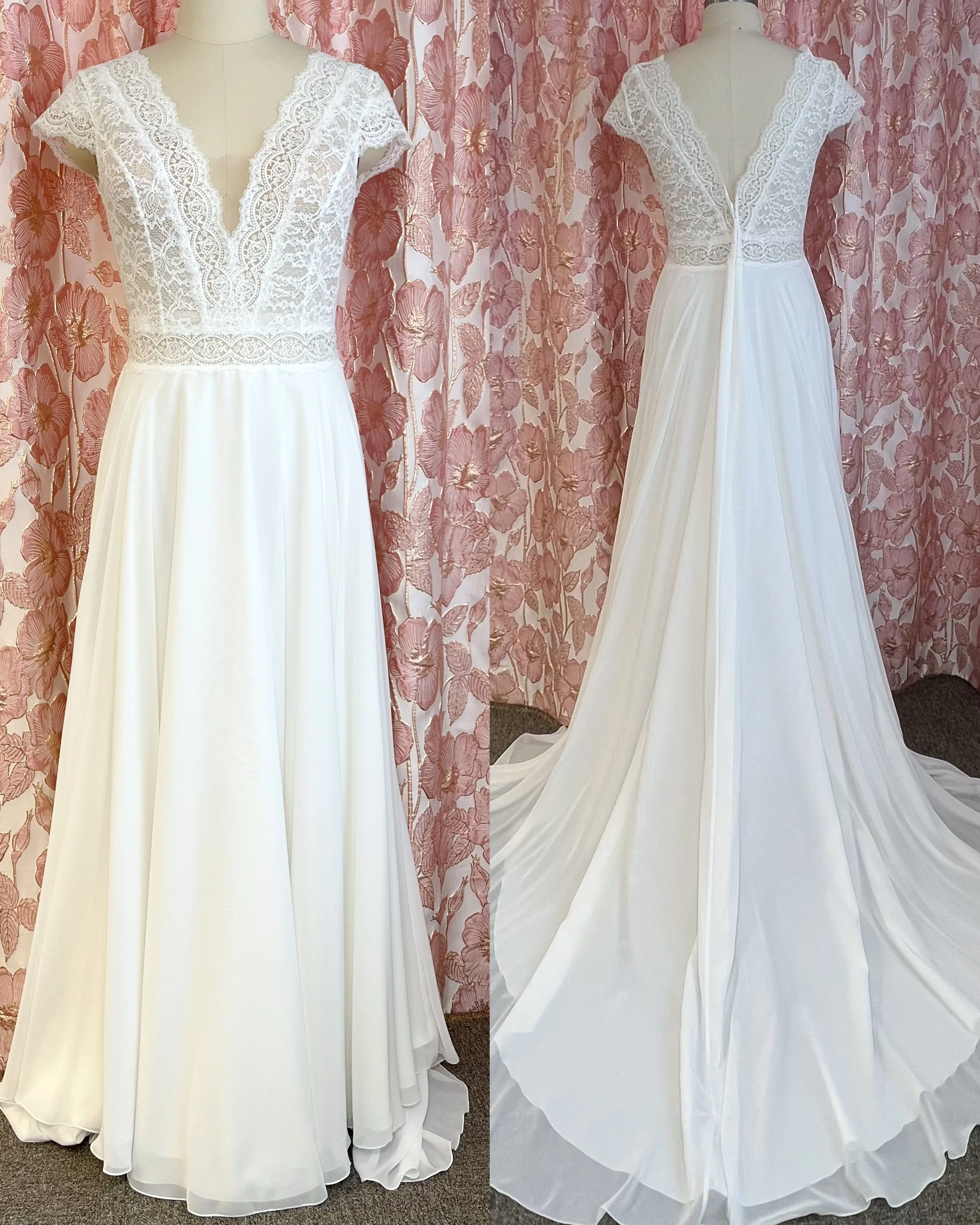 Kevyt sifonkihelmainen laahuksellinen hääpuku pitsiyläosalla. Sävy ivory