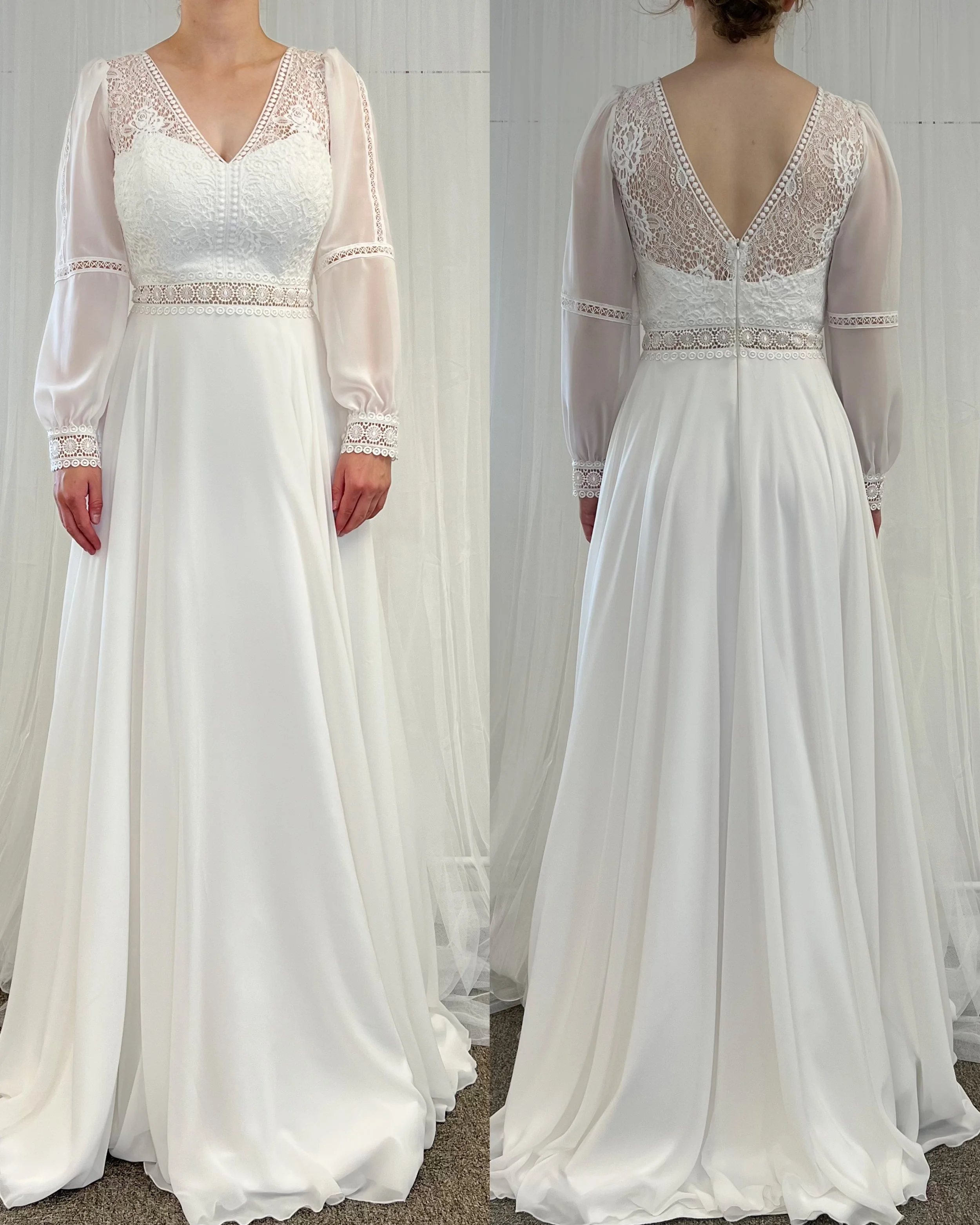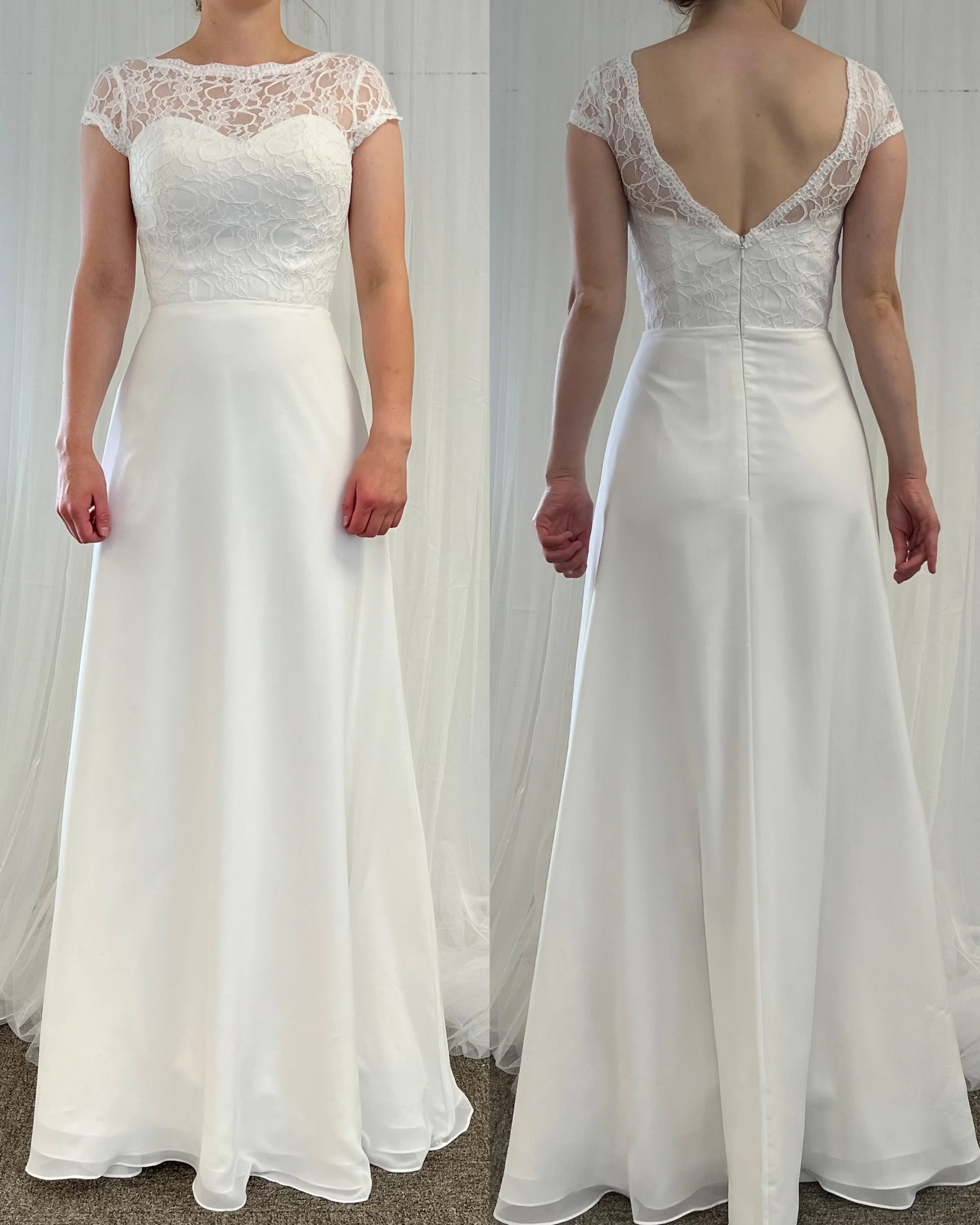 Sifonkihelmainen laahuksellinen puku pitsiyläosalla. Sävy ivory.