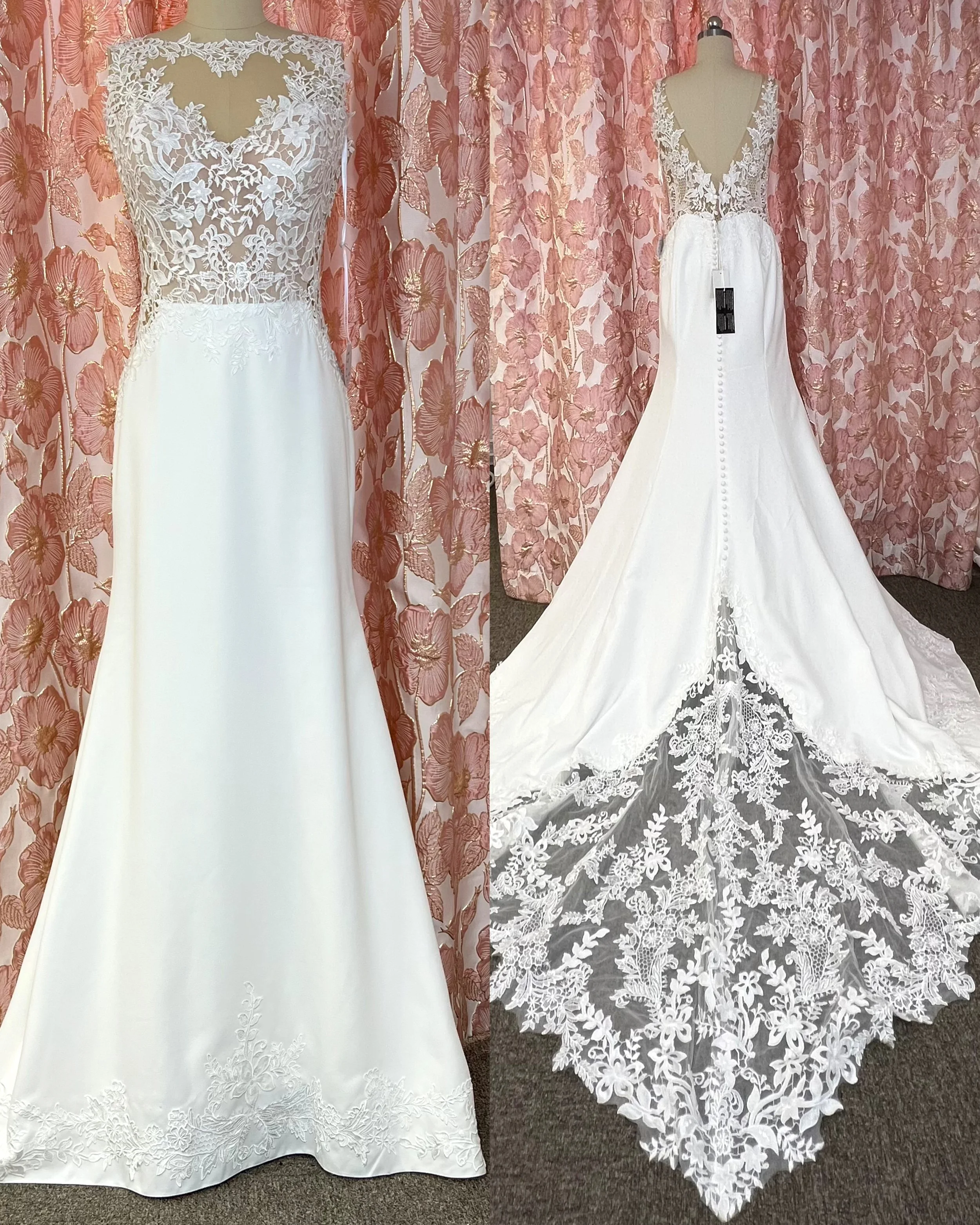 Kreppihelmainen merenneitopuku läpikuultavalla guipurepitsiyläosalla ja näyttävällä laahuksella. Sävy ivory-nude