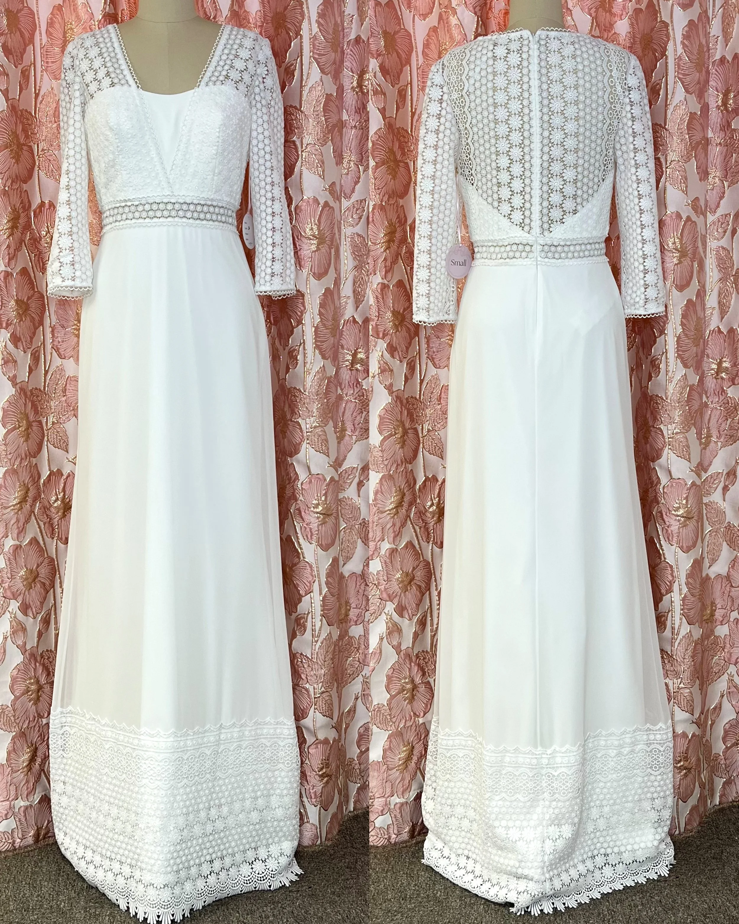 A-linjainen puku paksua sifonkia. Yläosassa useita erilaisia pitsejä ja kapeat 3/4-hihat. Sävy ivory.