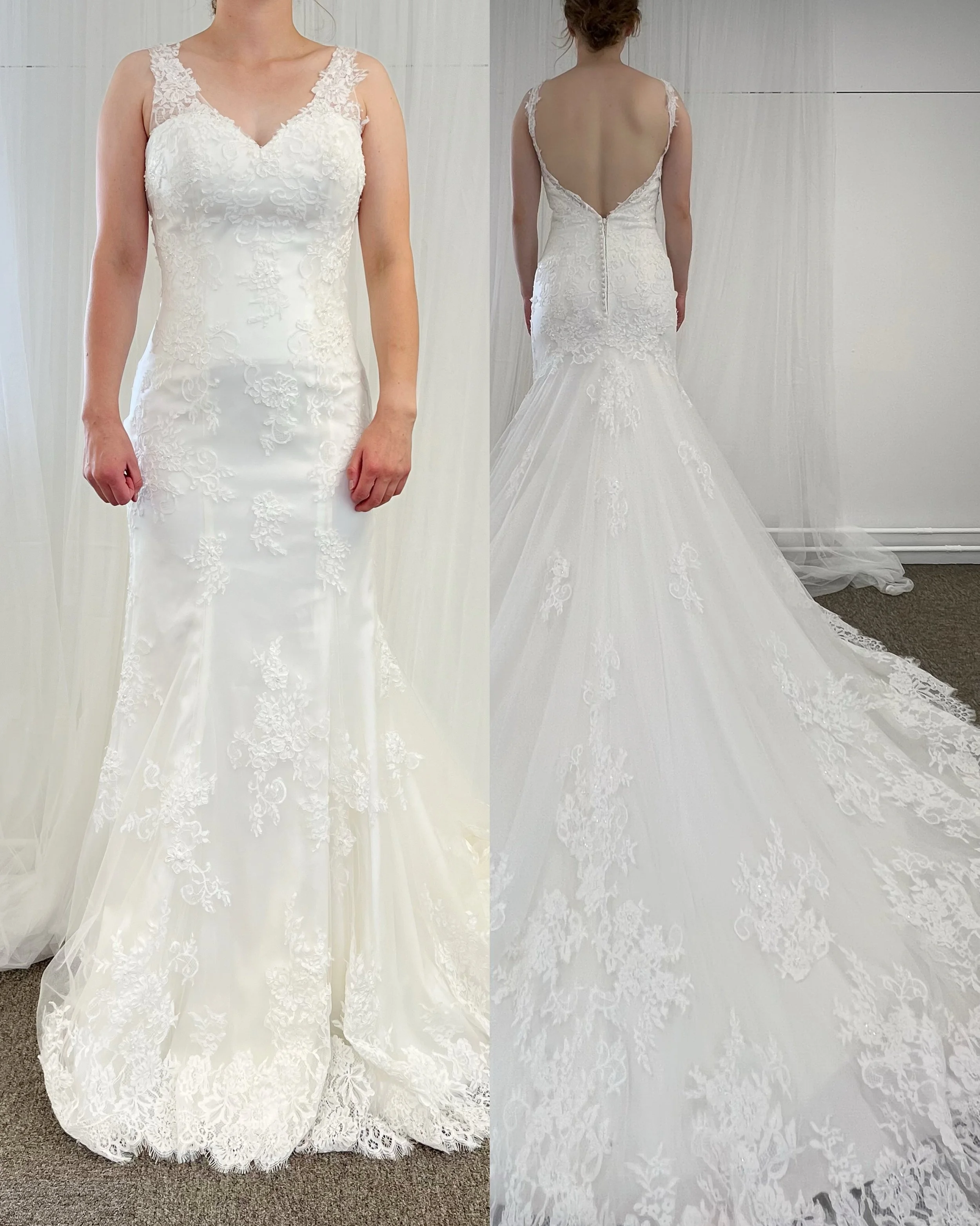 Satiininen merenneitopuku laahuksella ja pitsikoristellulla yläosalla. Selässä paljettikirjailtua illuusiotylliä. Yläosan pitseissä myös helmikirjailua. Sävy ivory-nude.