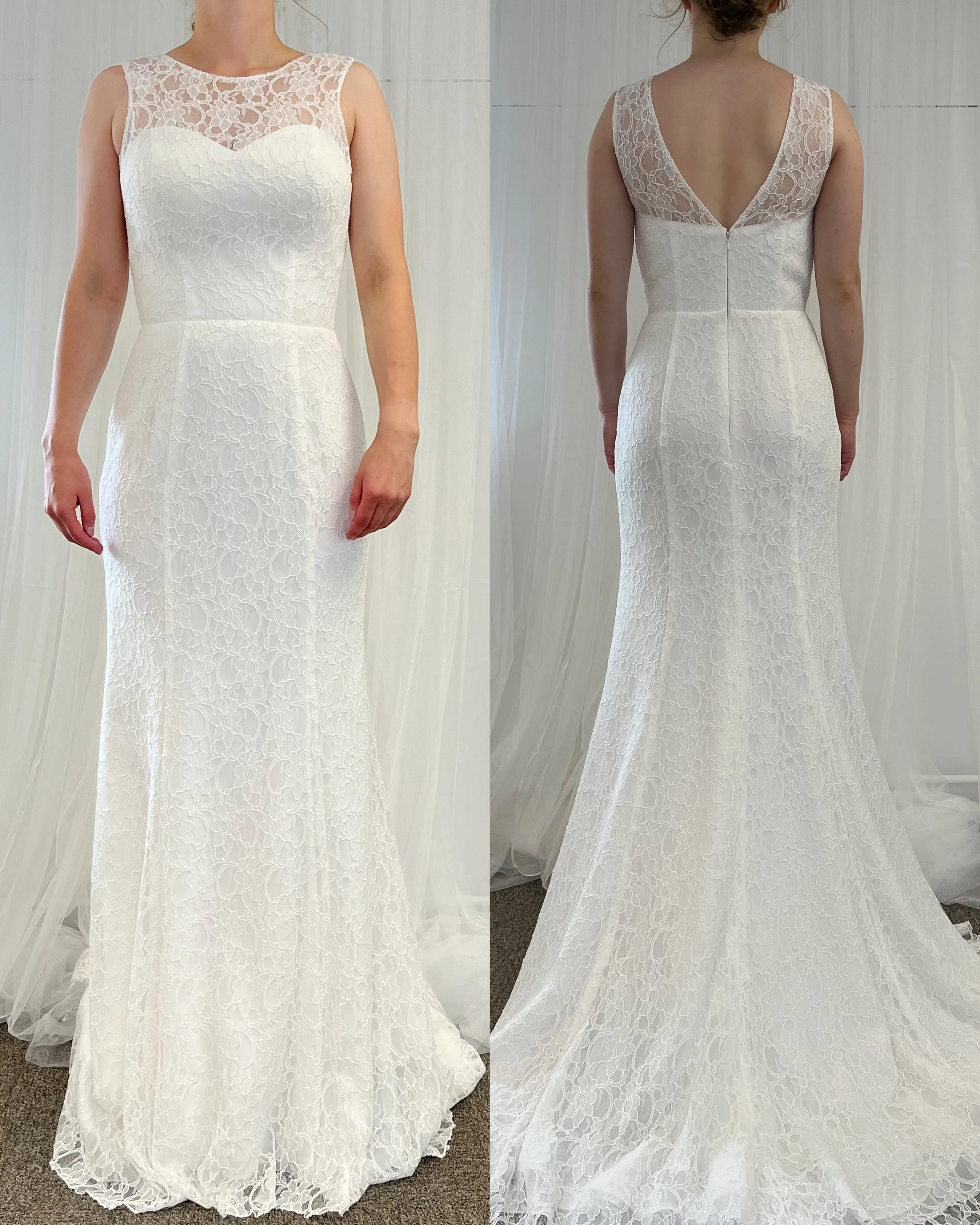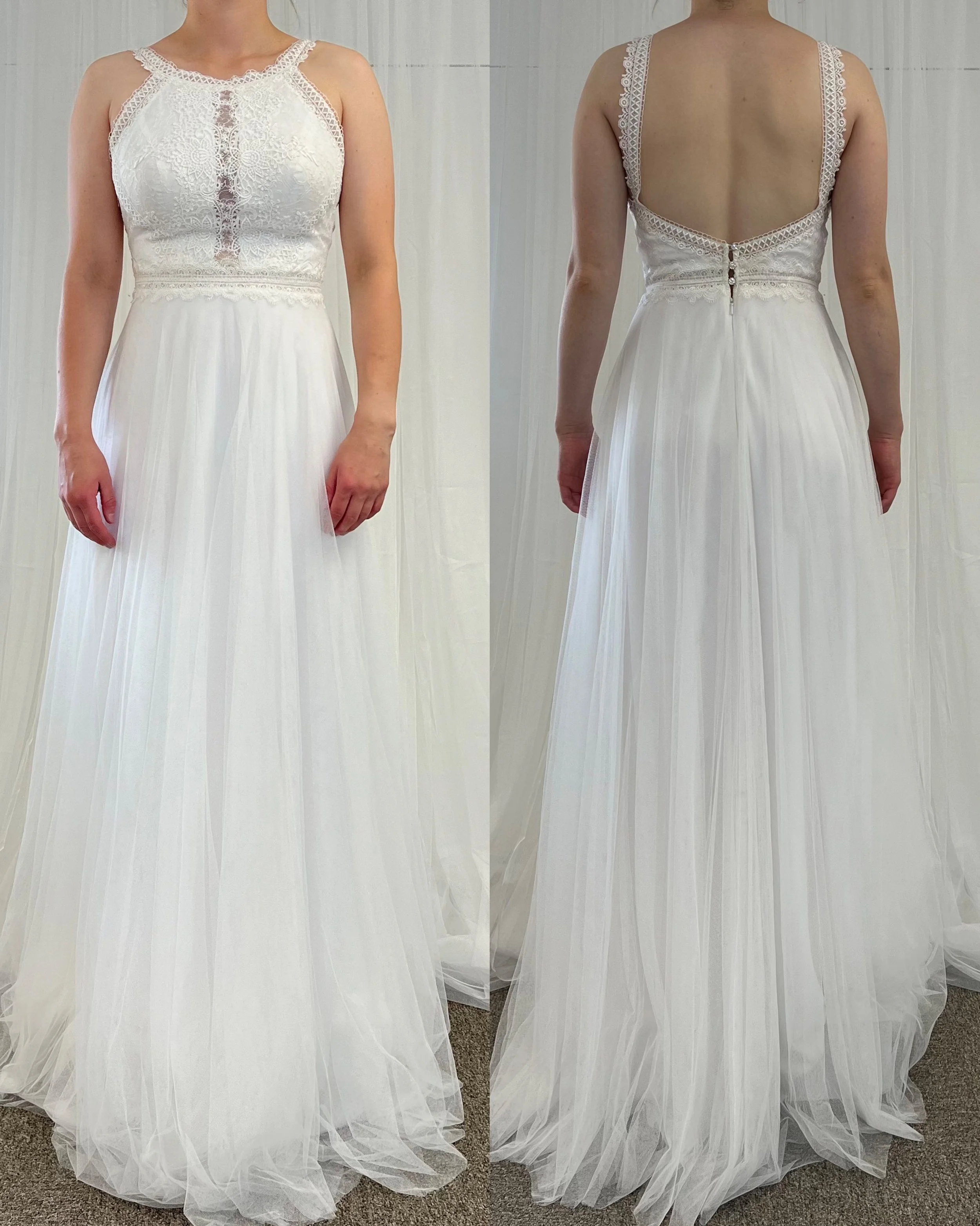 Kepeä tyllihelmainen laahukseton puku pitsikoristellulla yläosalla. Sävy ivory