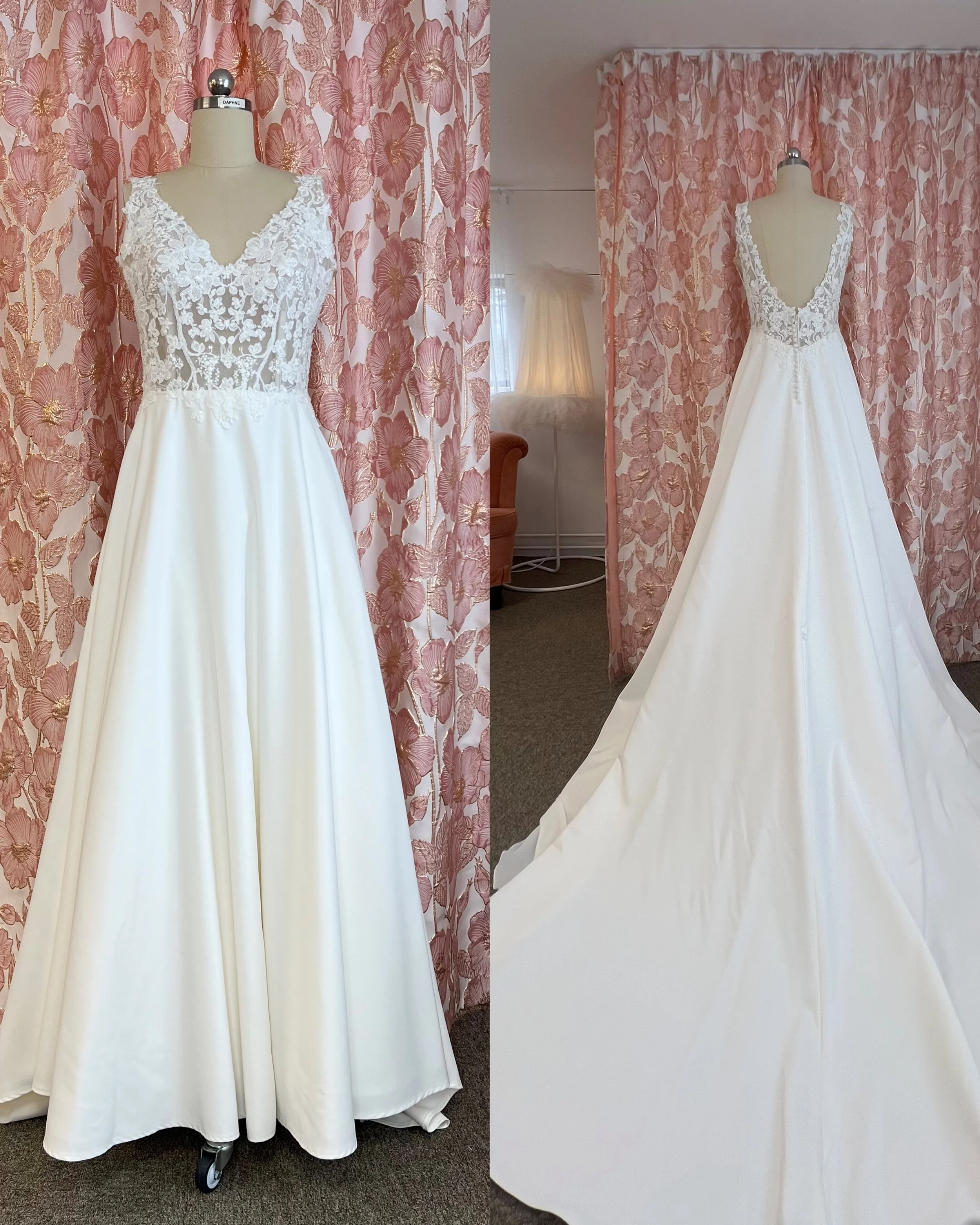 Kevyesti levenevä satiinihelmainen puku halterneck-pitsiyläosalla. Puvun mukana tulee pukupussi. Sävy ivory.
