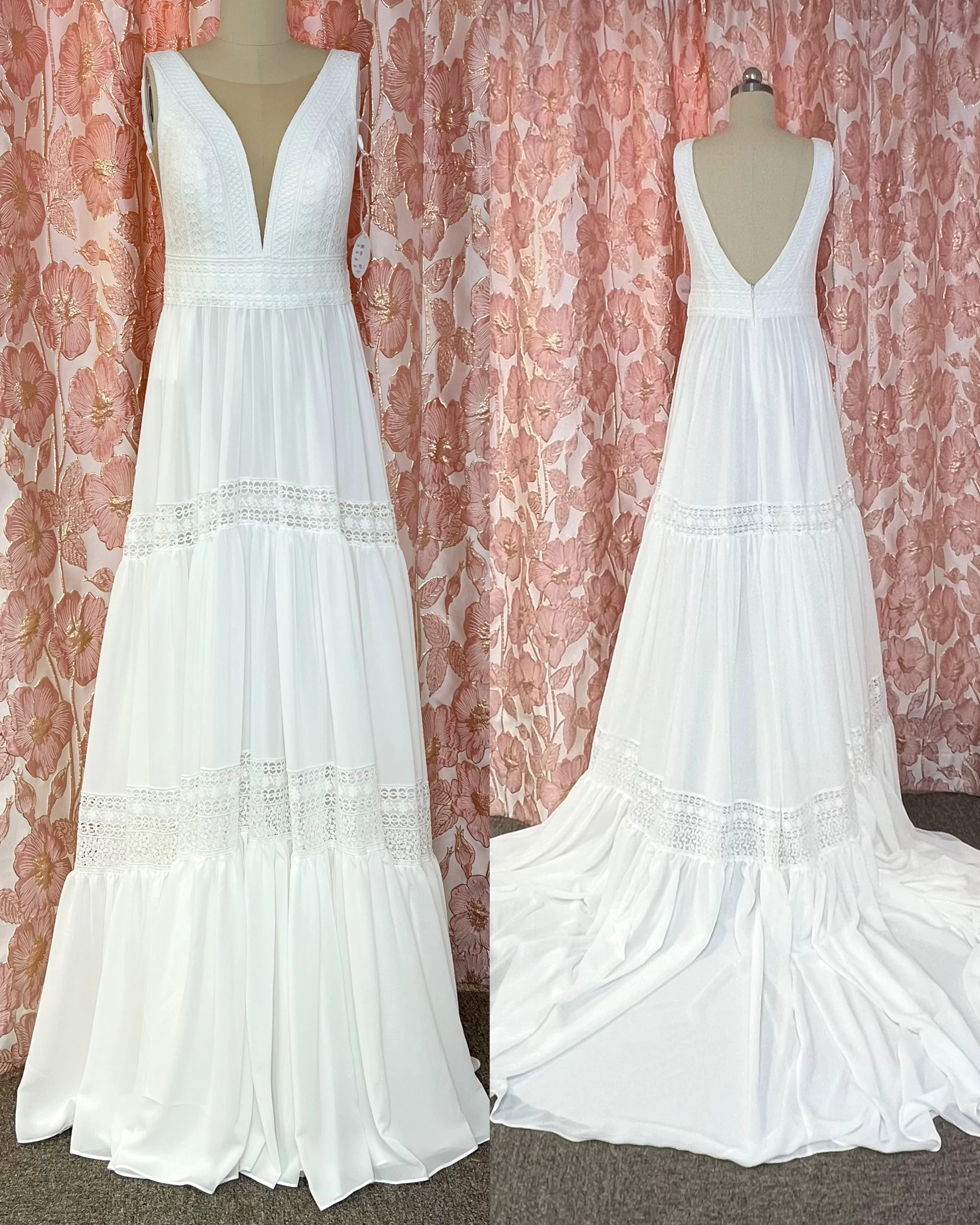 Kevyt sifonkihelmainen laahukseton puku halterneck-pitsiyläosalla