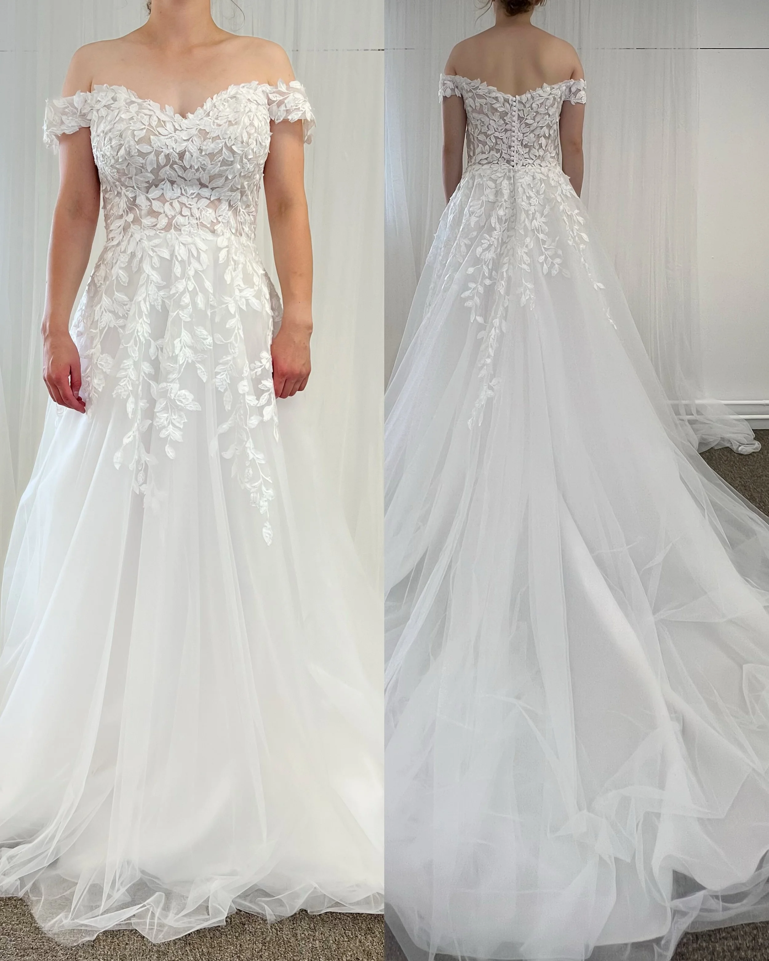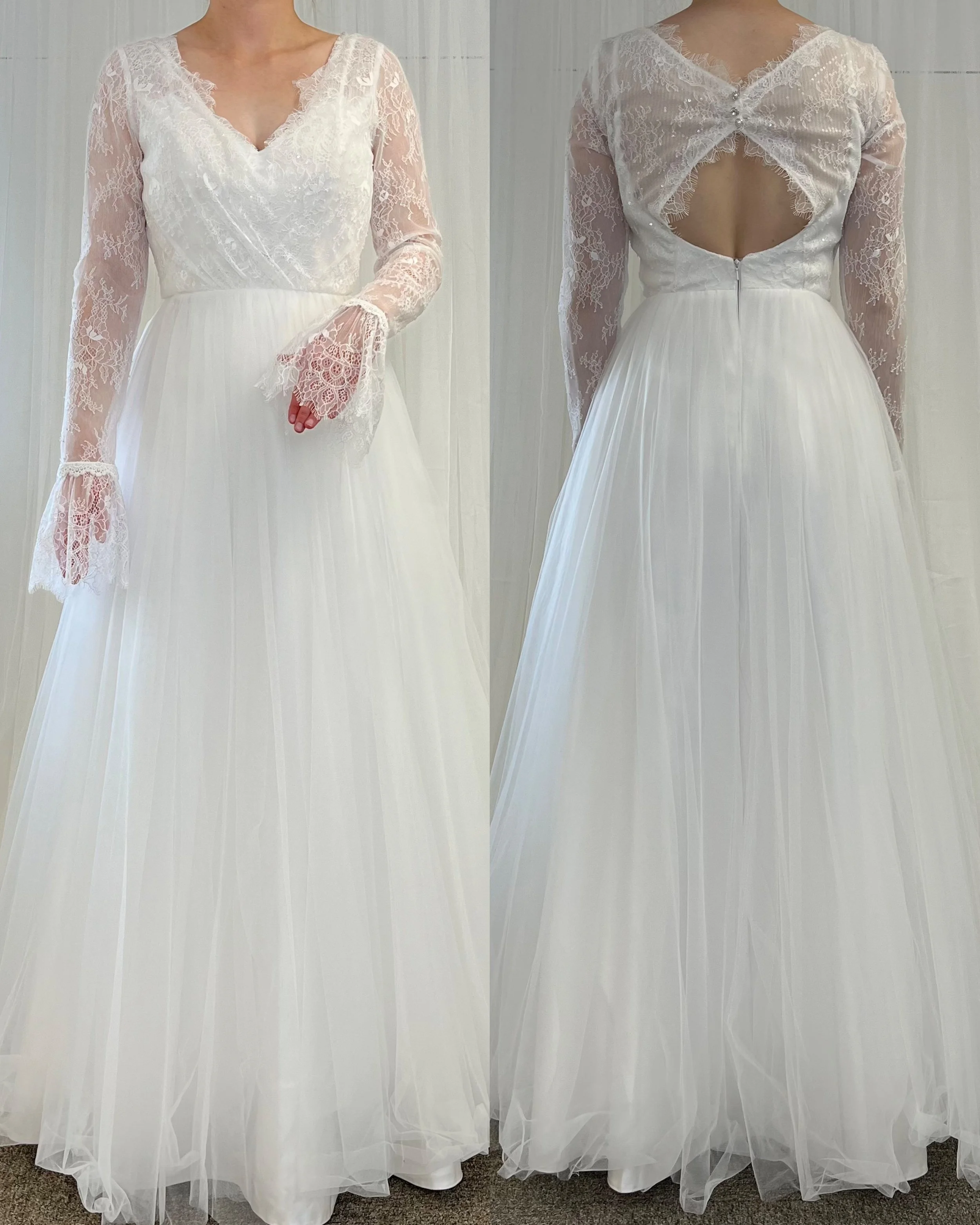 Upea pitkähihainen 3D-pitseillä koristeltu tyllipuku. Sävy ivory. Puvun mukana tulee alushame ja pukupussi.