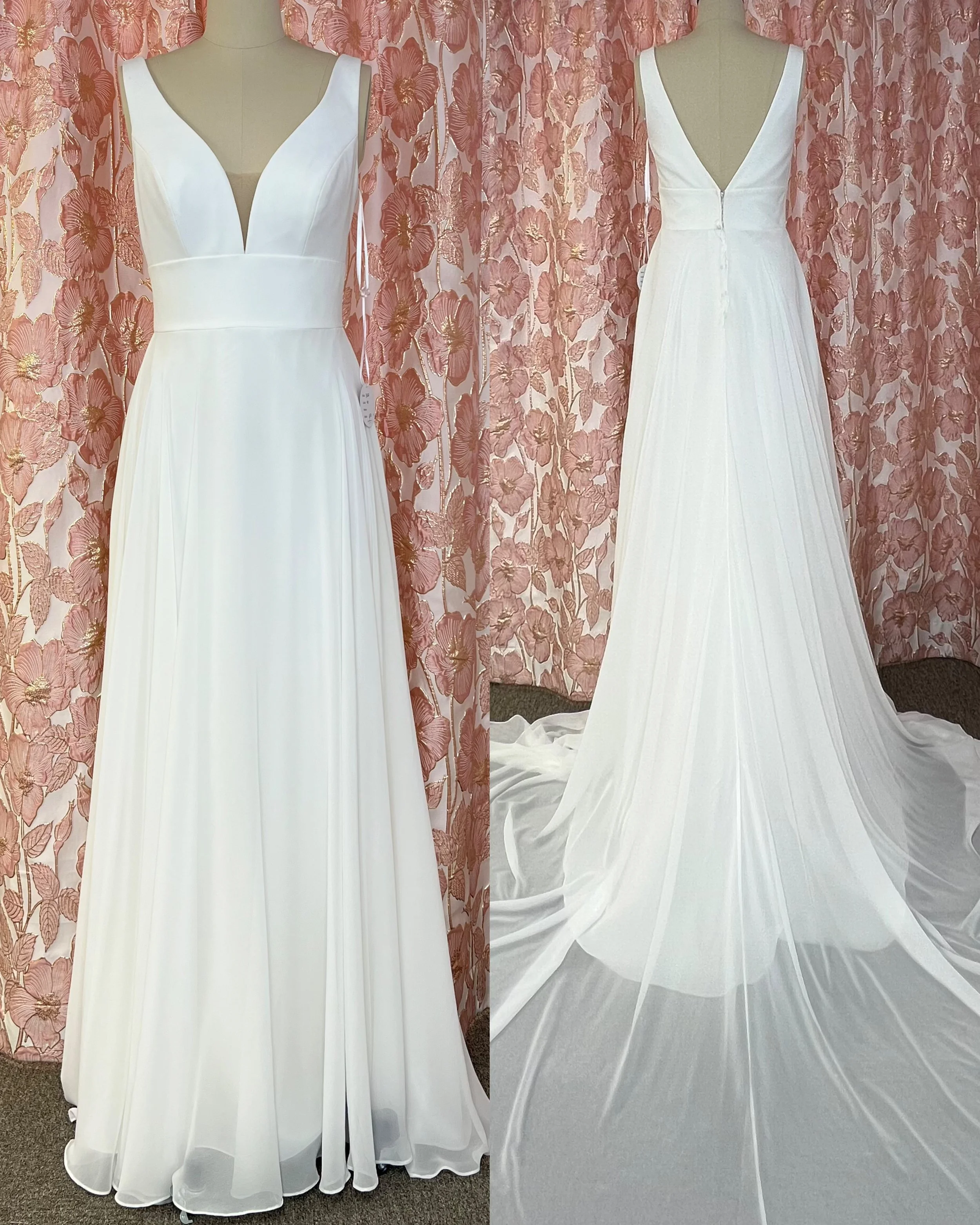 Sifonkinen olkaimeton puku laahuksella. Helmassa halkio. Sävy ivory.