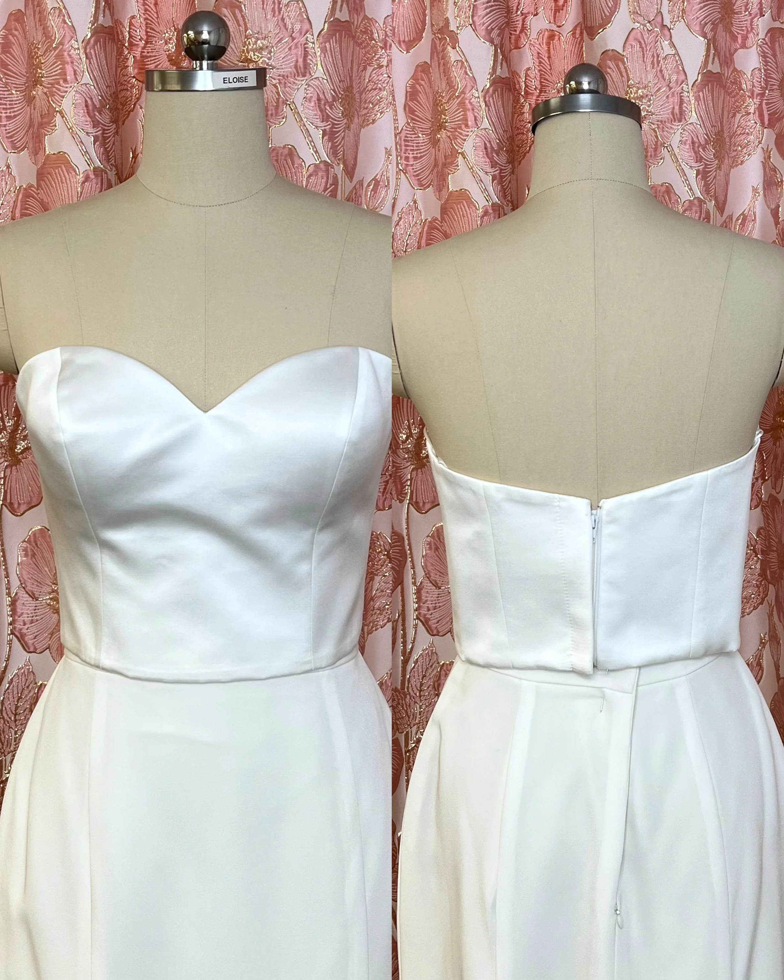 Olkaimeton vedostettu puku kevyttä silkkiröyhelöä. Sävy ivory