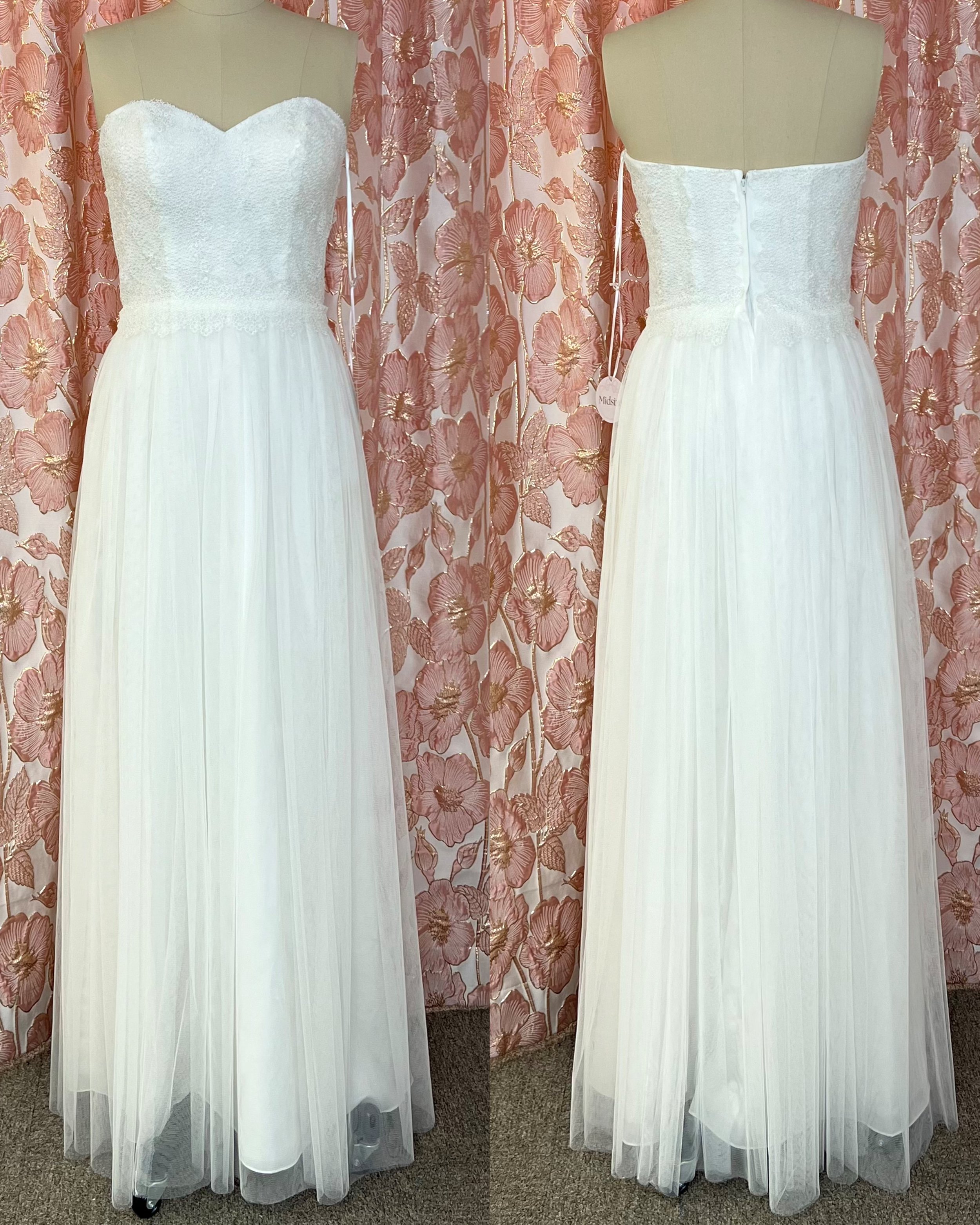 Vedostettu olkaimeton tyllipuku laahuksella. Pukuun saa helposti offshoulder-olkaimet. Sävy ivory.