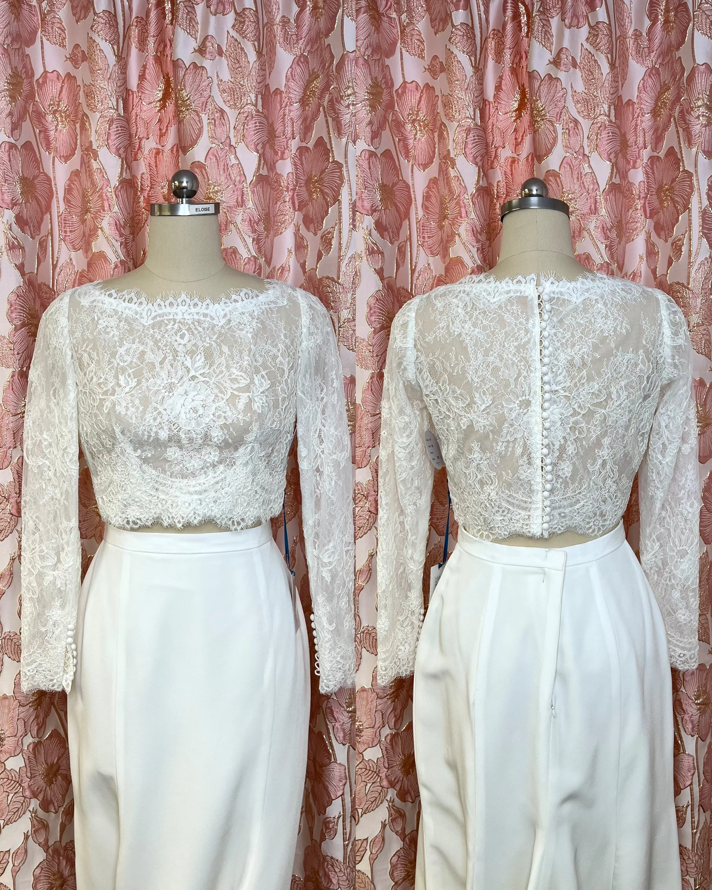 Pitkähihainen pitsiyläosa. Selässä kangasnapit. Vuoritettu ihonsävyisellä tyllillä. Sävy ivory-nude.