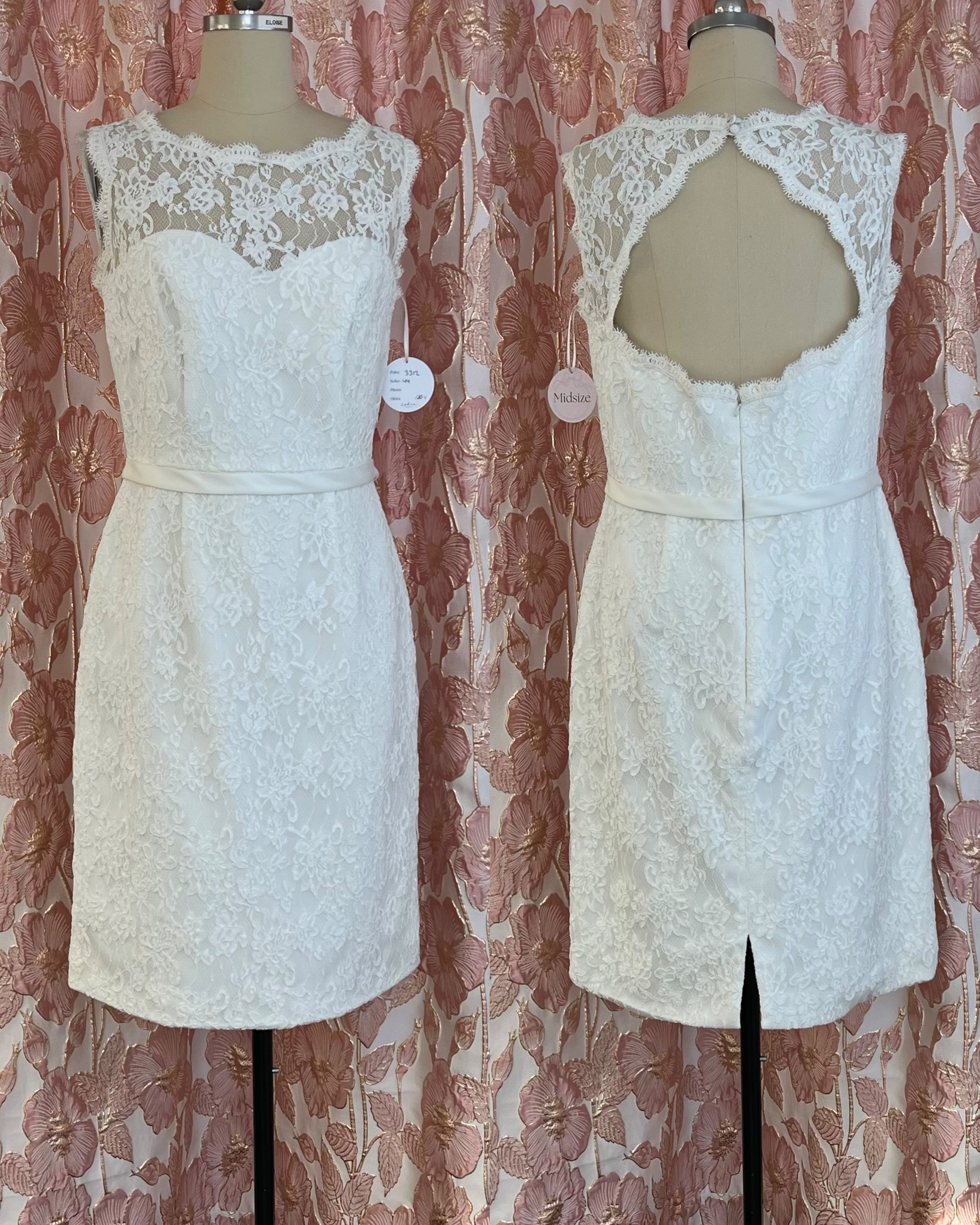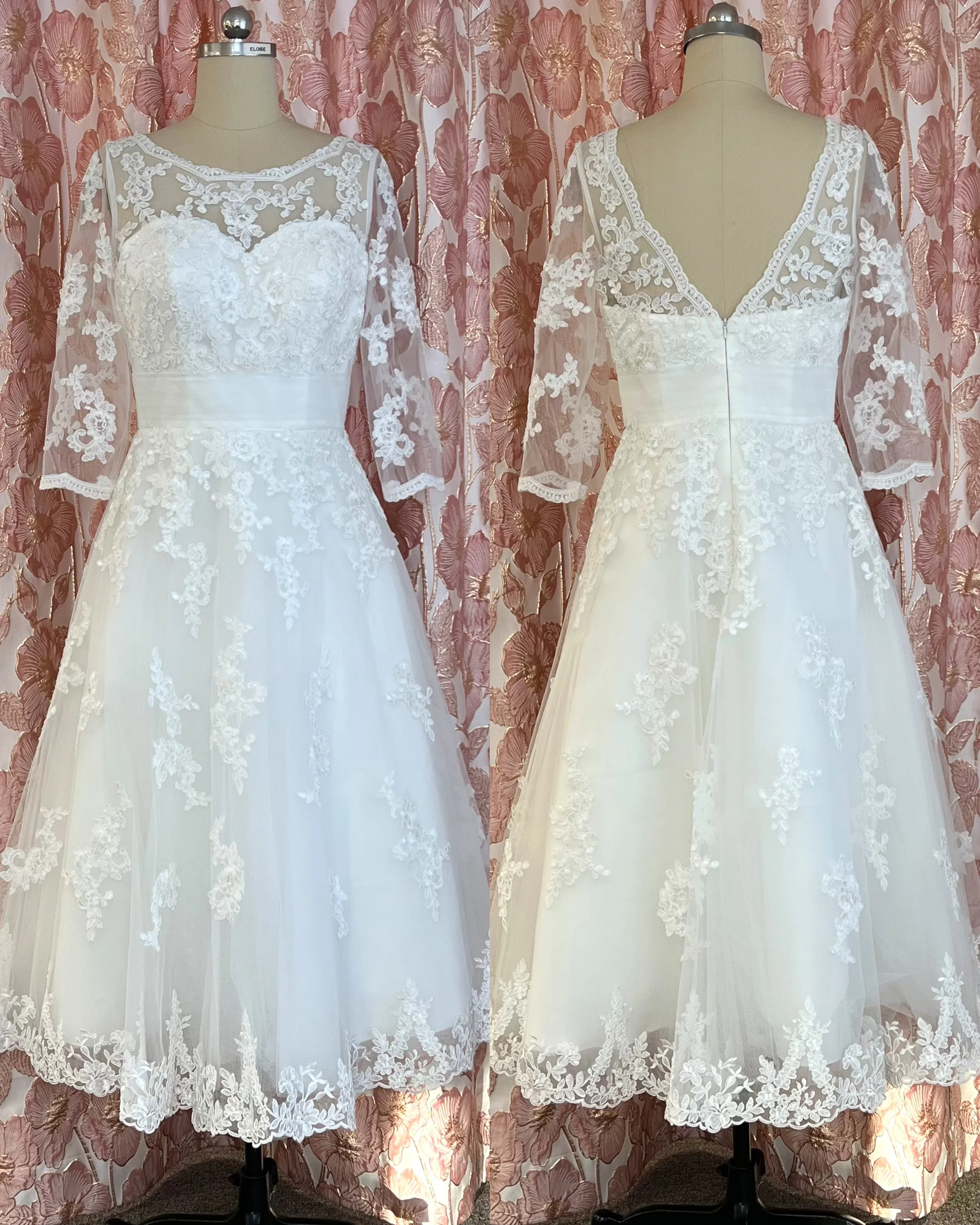 Midimittainen fiftarihenkinen lyhyt hääpuku. Sävy ivory.