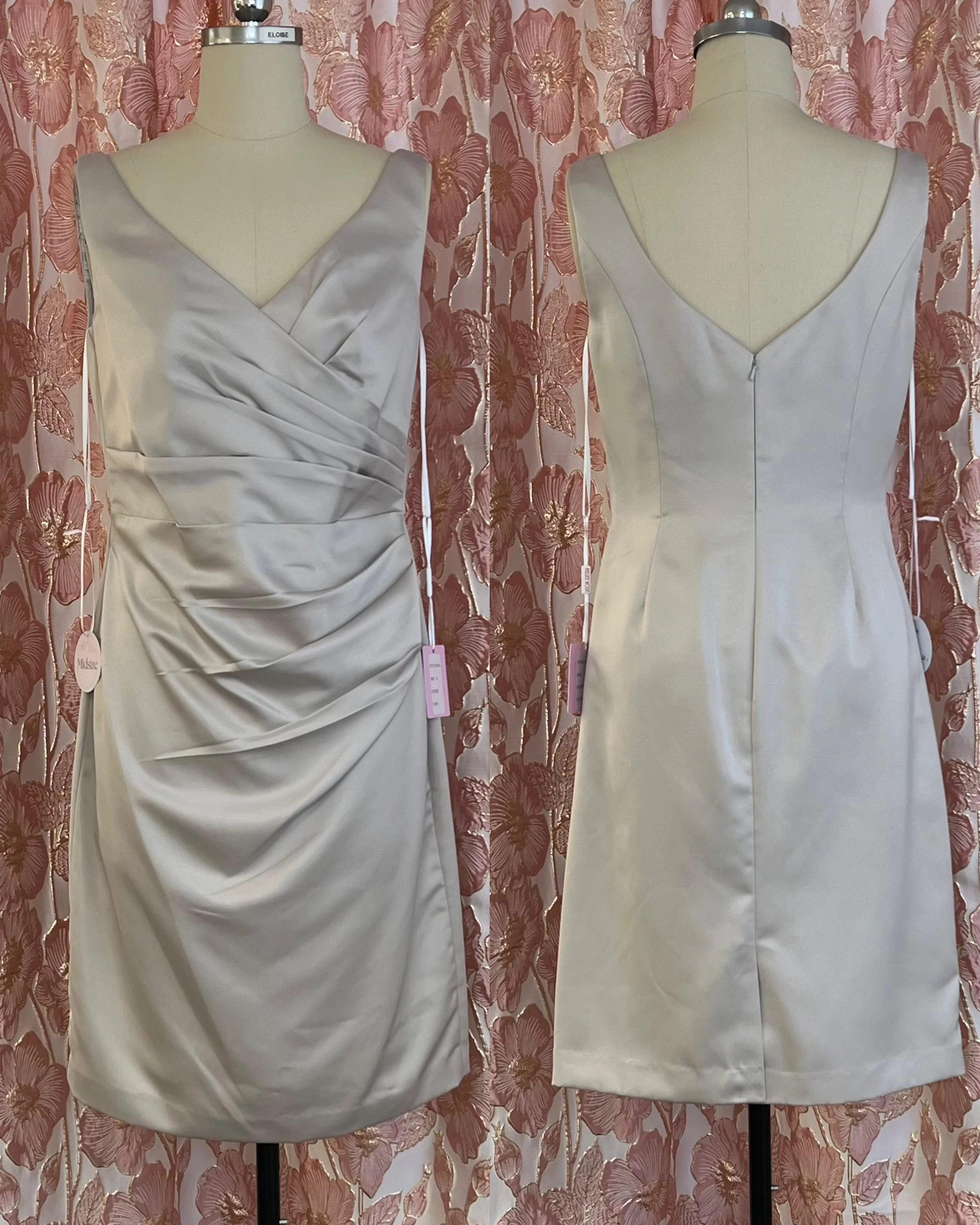 Lyhyt satiininen vedostettu kotelomekko. Sävy vaalea harmaanruskea.