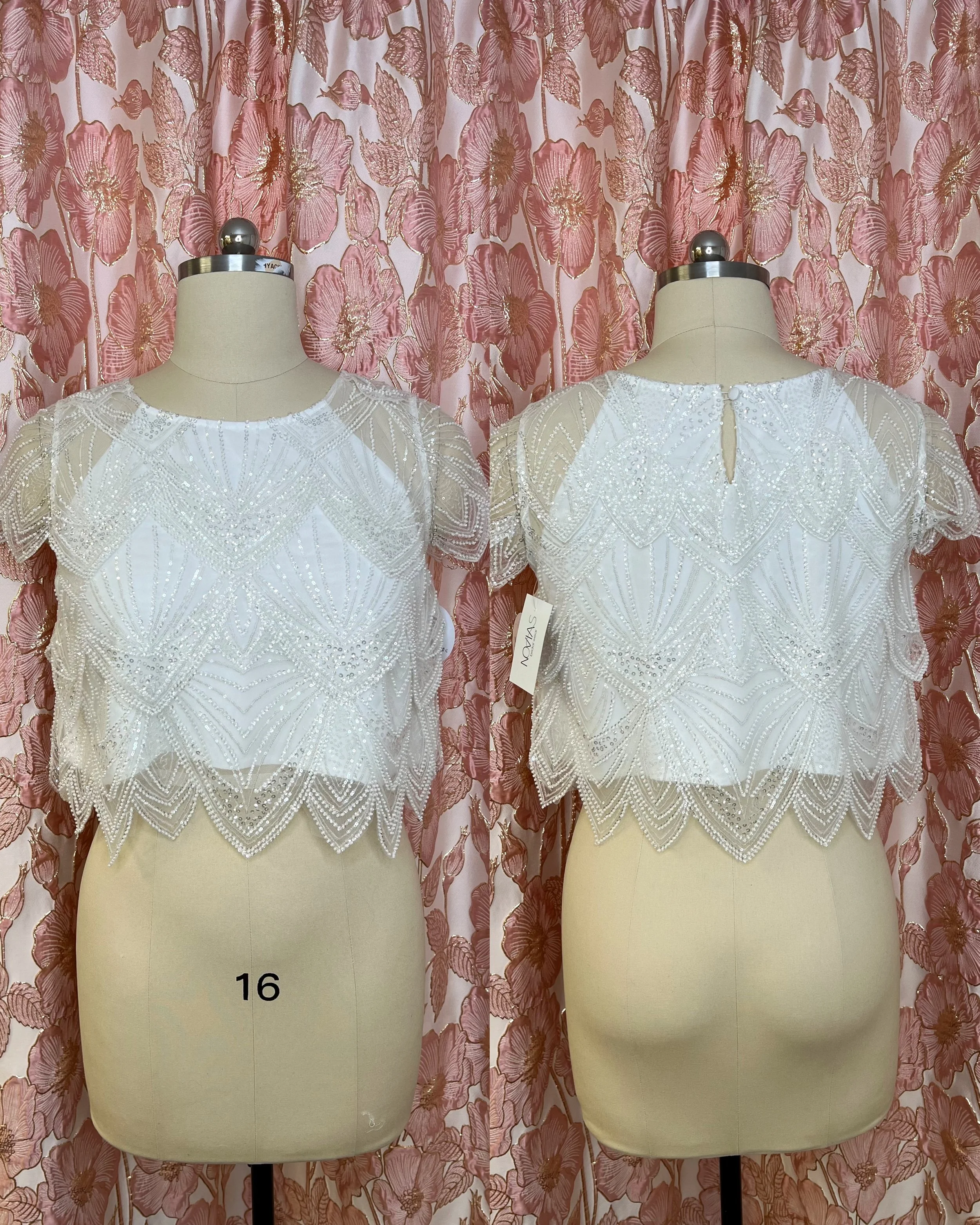 Helmikirjailtu satiininen pitsitoppi. Sävy ivory-silver.