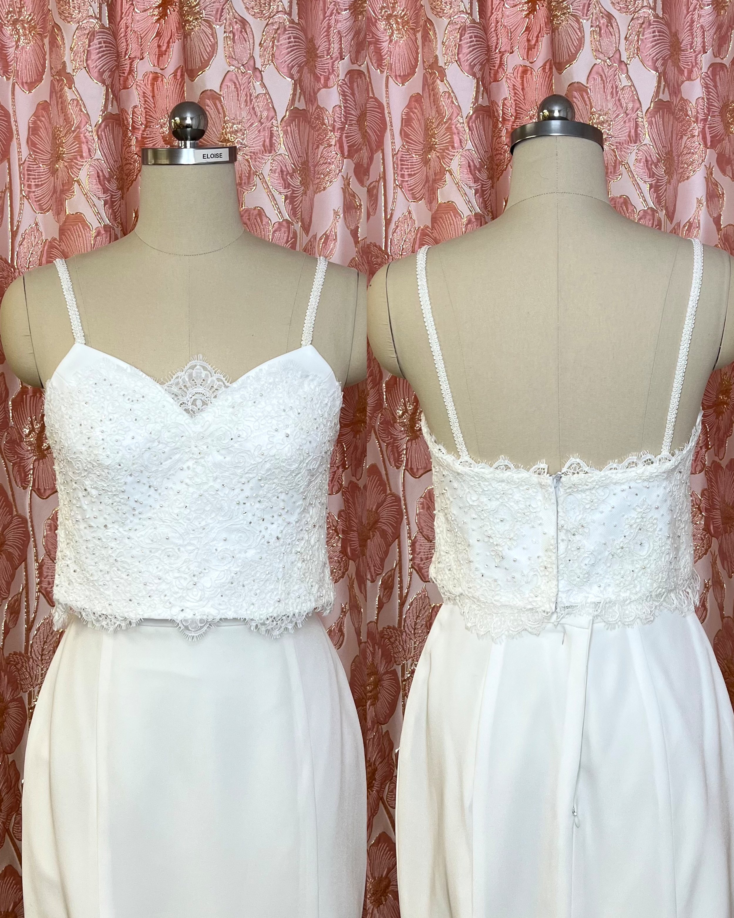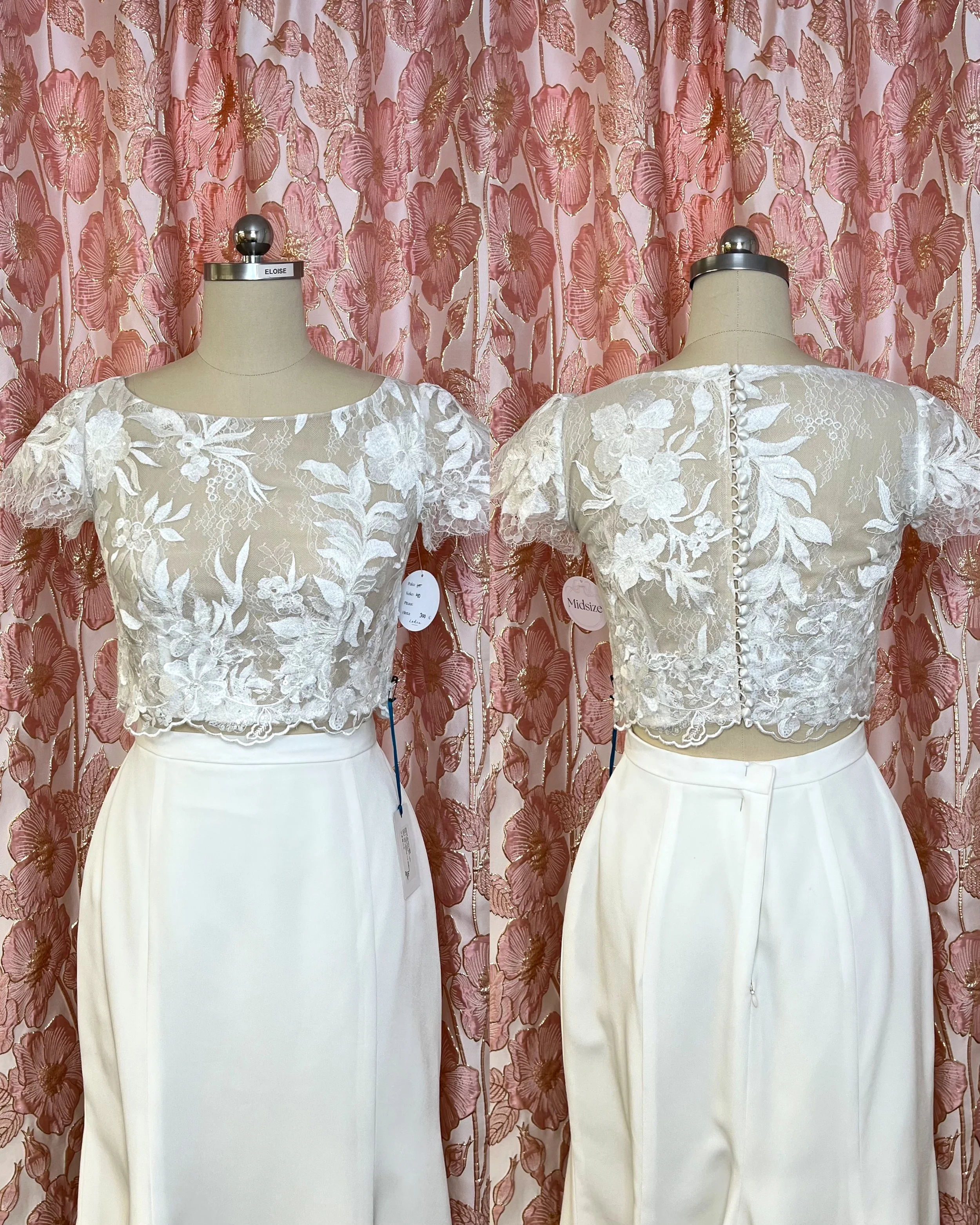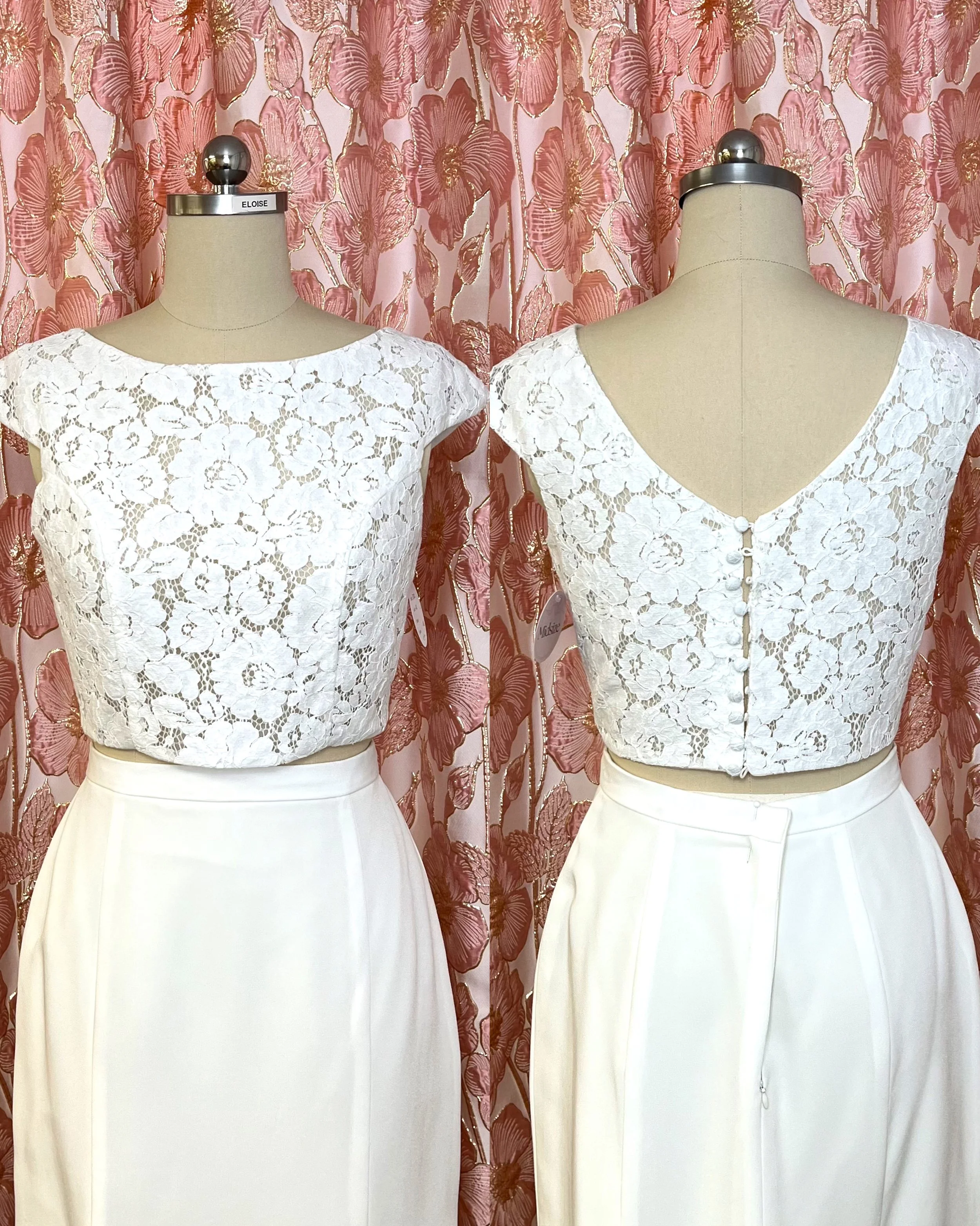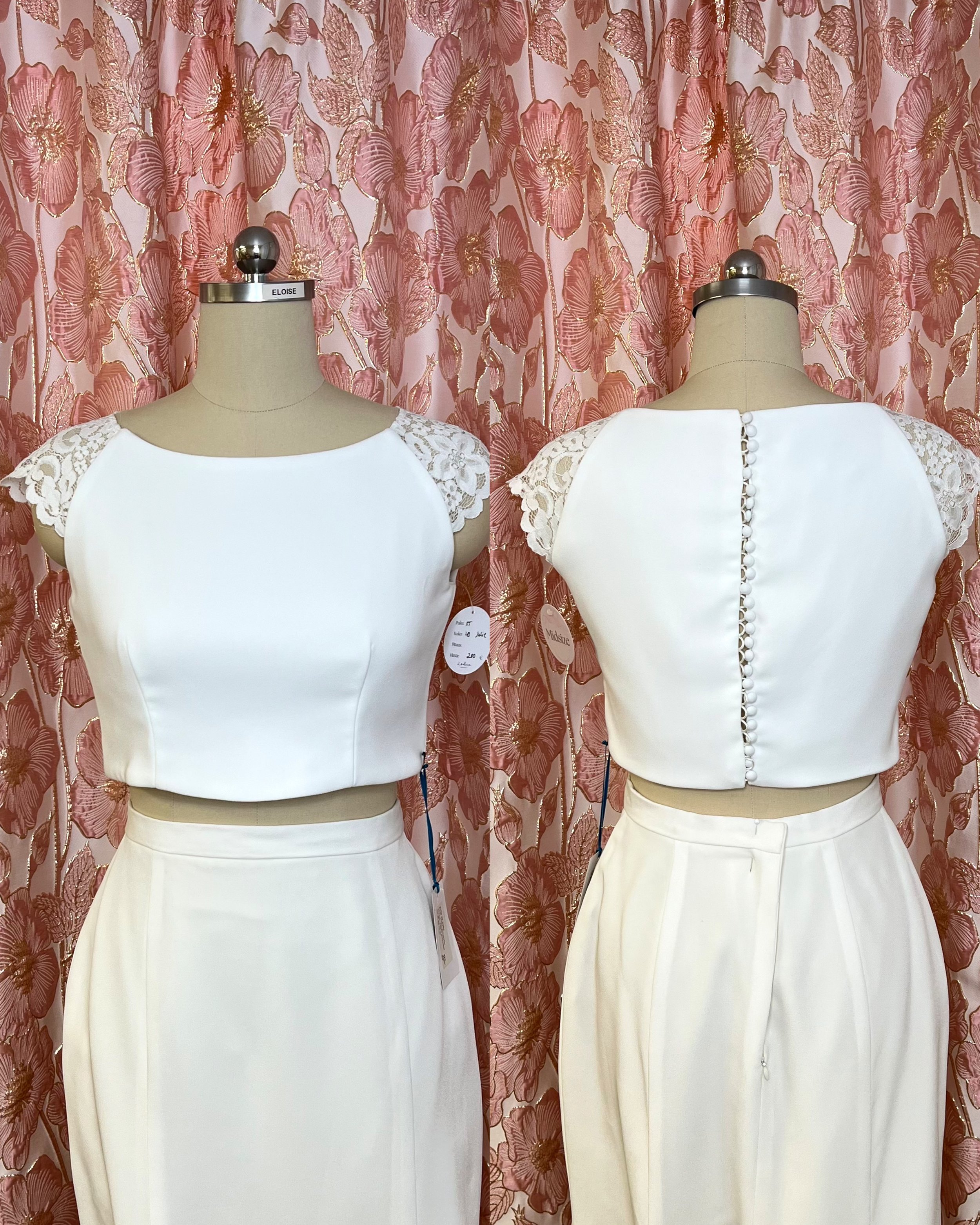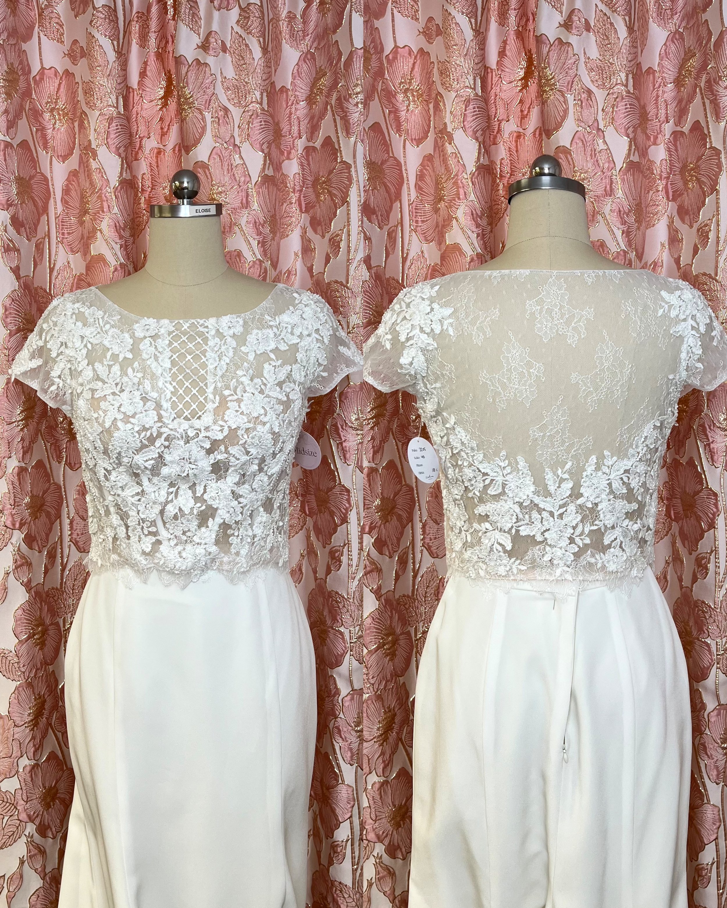 Kreppihelmainen kapealinjainen puku pitsiyläosalla. Puvussa on tummentumaa takaosassa. Sävy ivory. Puvun mukana tulee pukupussi.