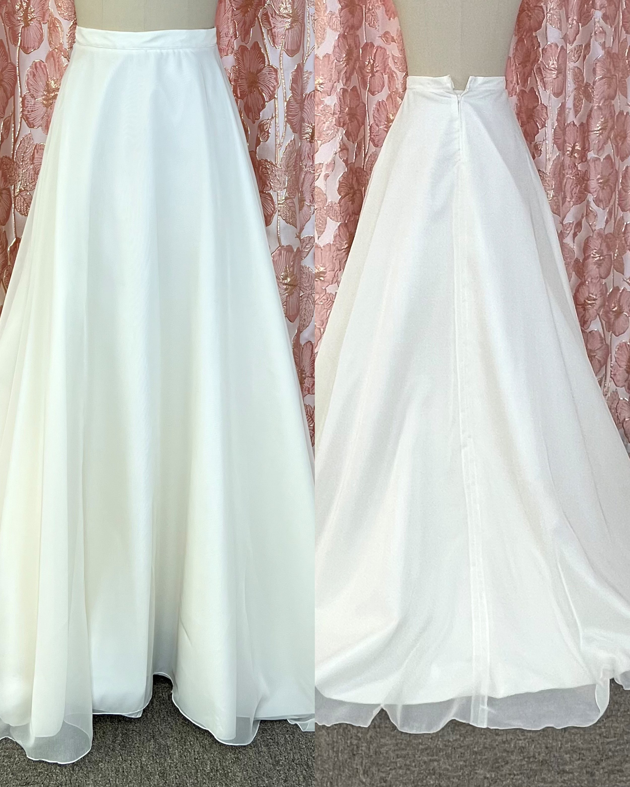 A-linjainen hame pehmeää laskeutuvaa organzaa. Pieni laahus. Sävy ivory.