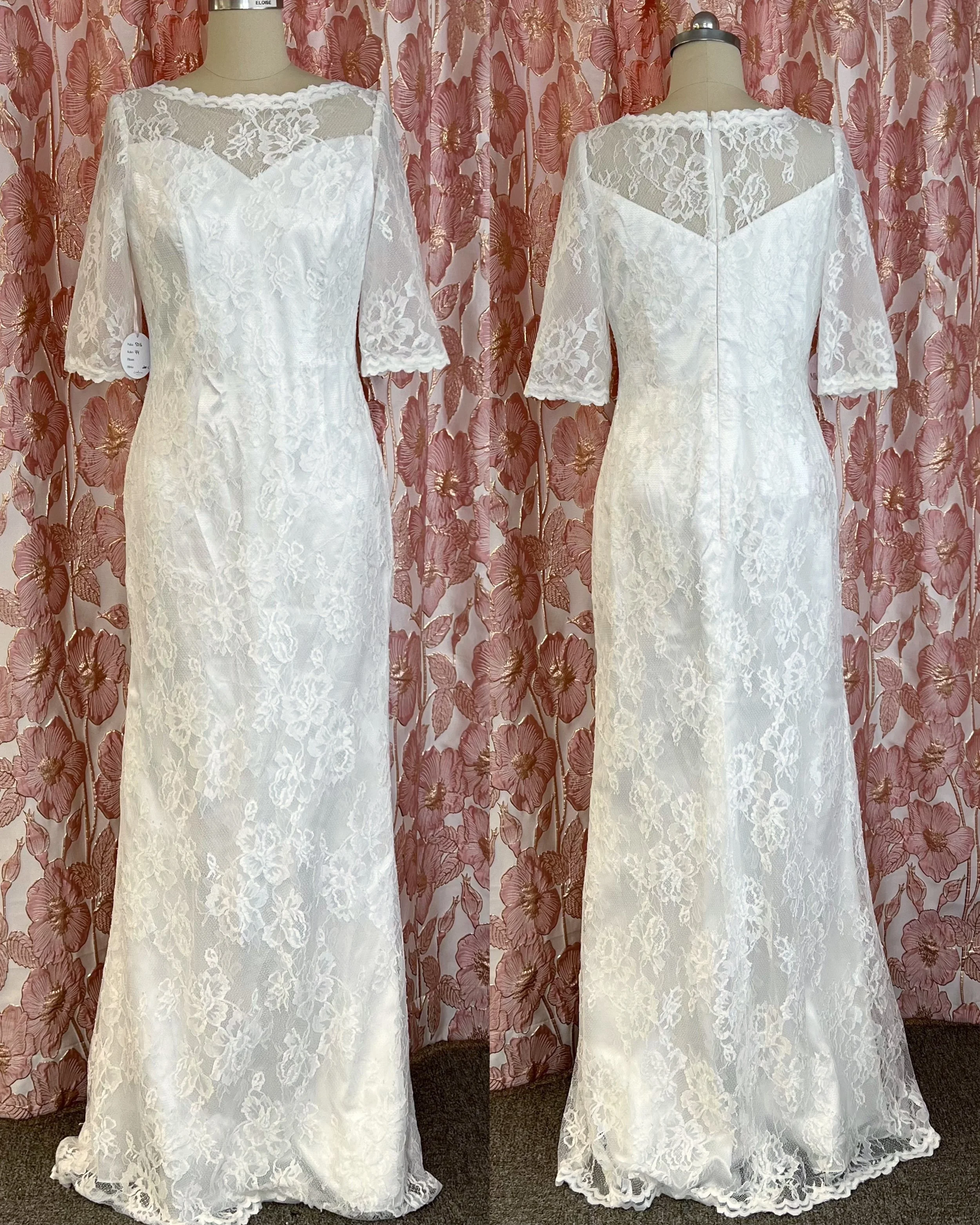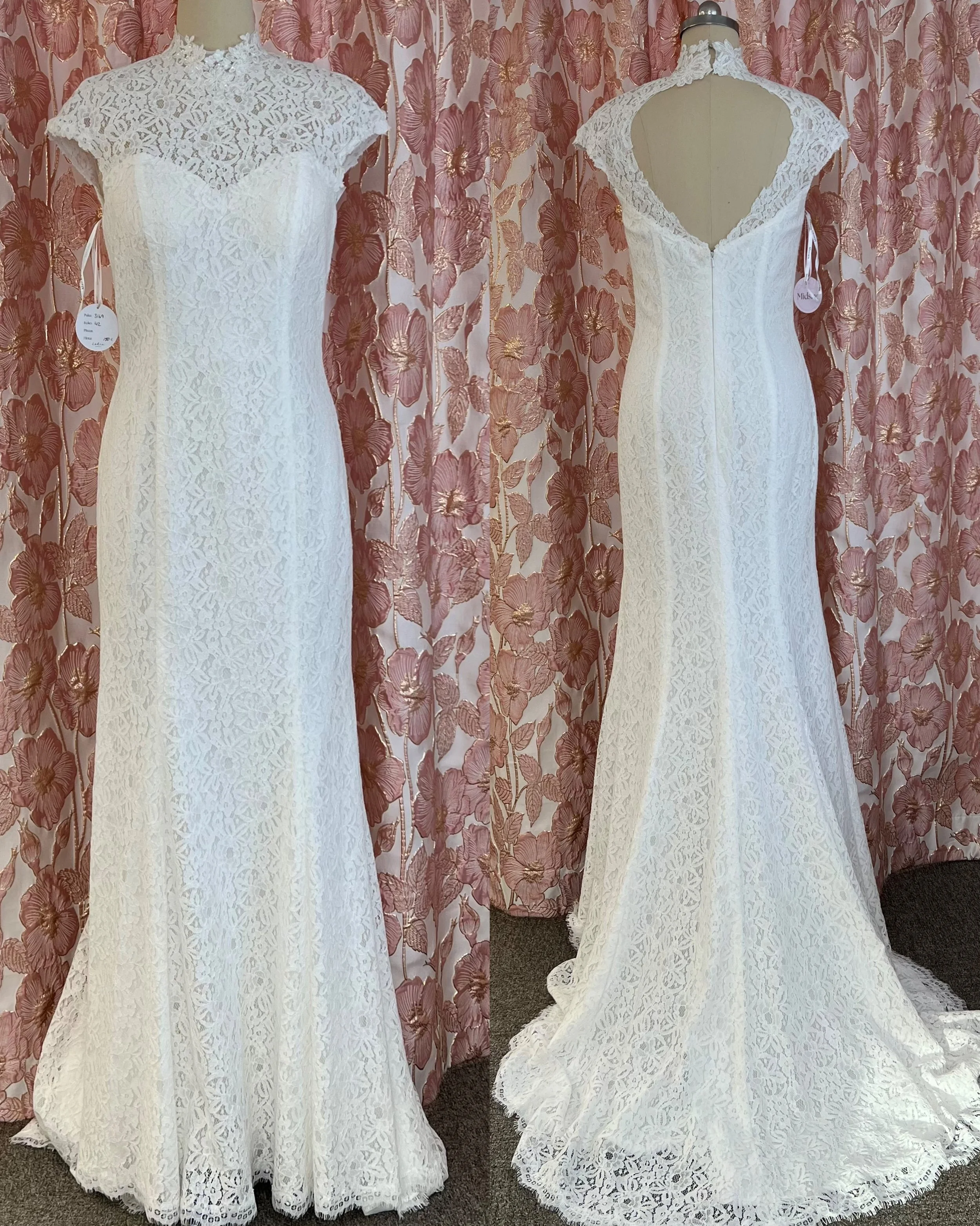 Merenneitomallinen puku hieman joustavaa kreppiä. Pienet pitsihihat ja pitsiyksityiskohdat laahuksessa. Sävy ivory-nude.