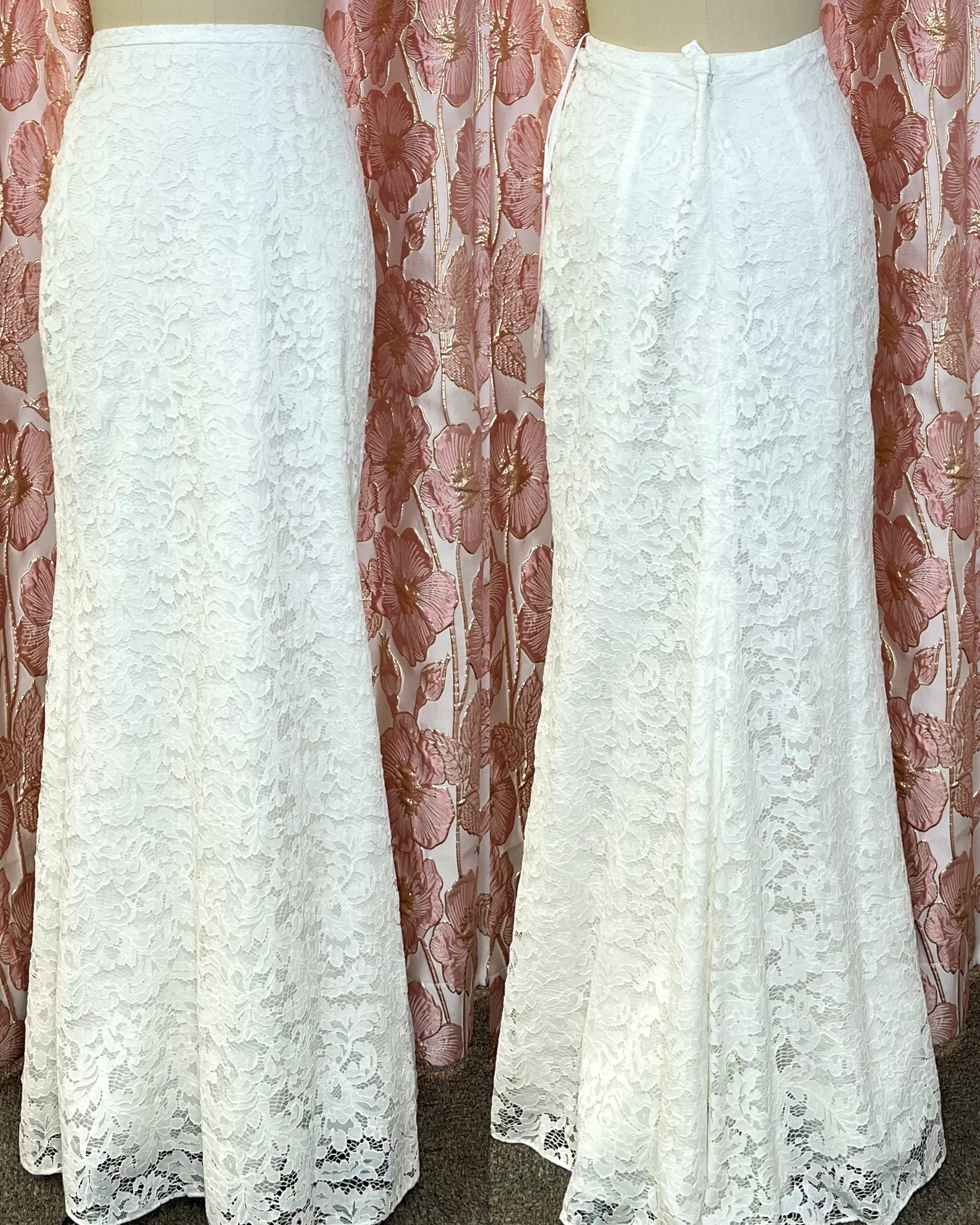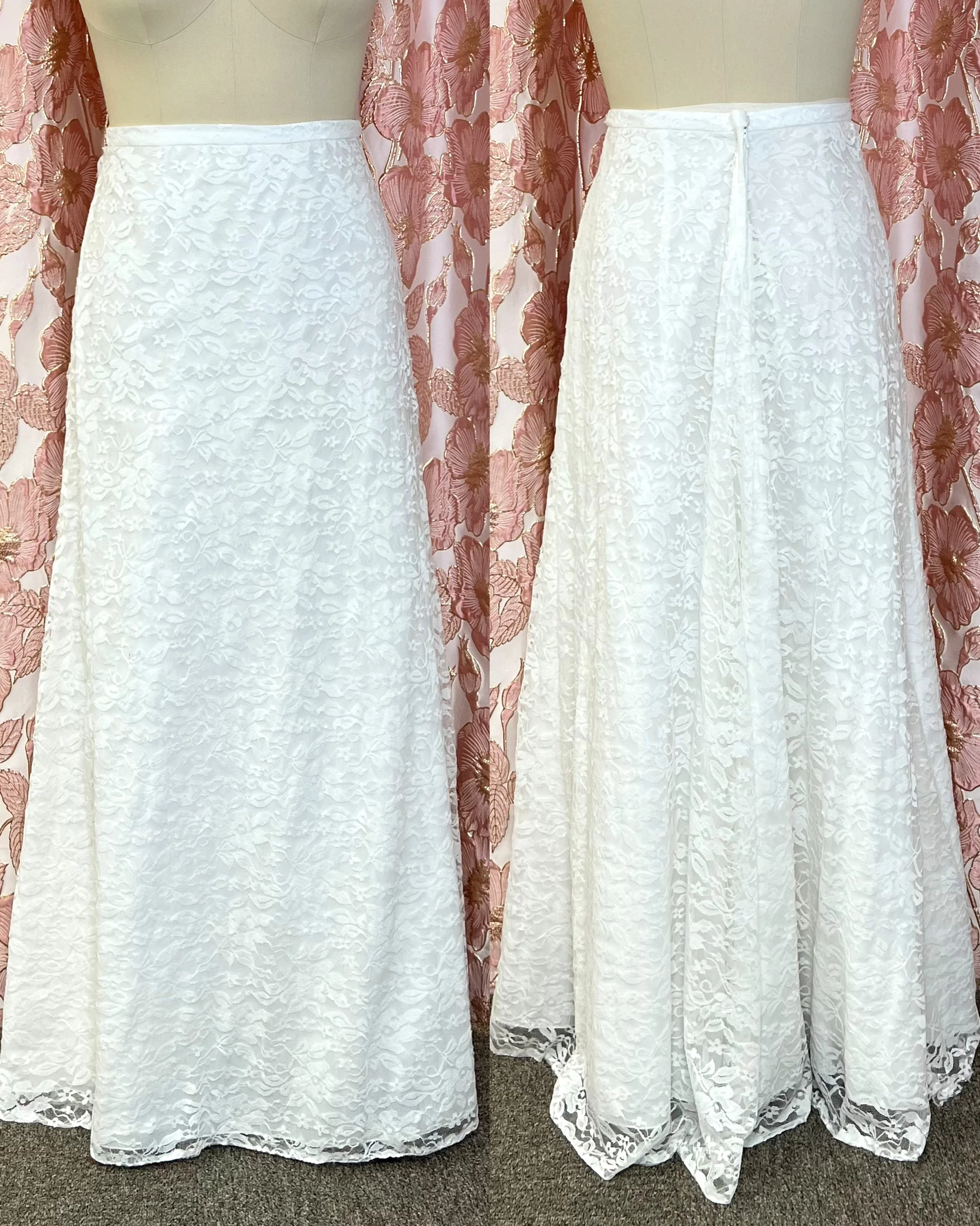 Täyspitkä laahukseton pitsihame. Sävy ivory.