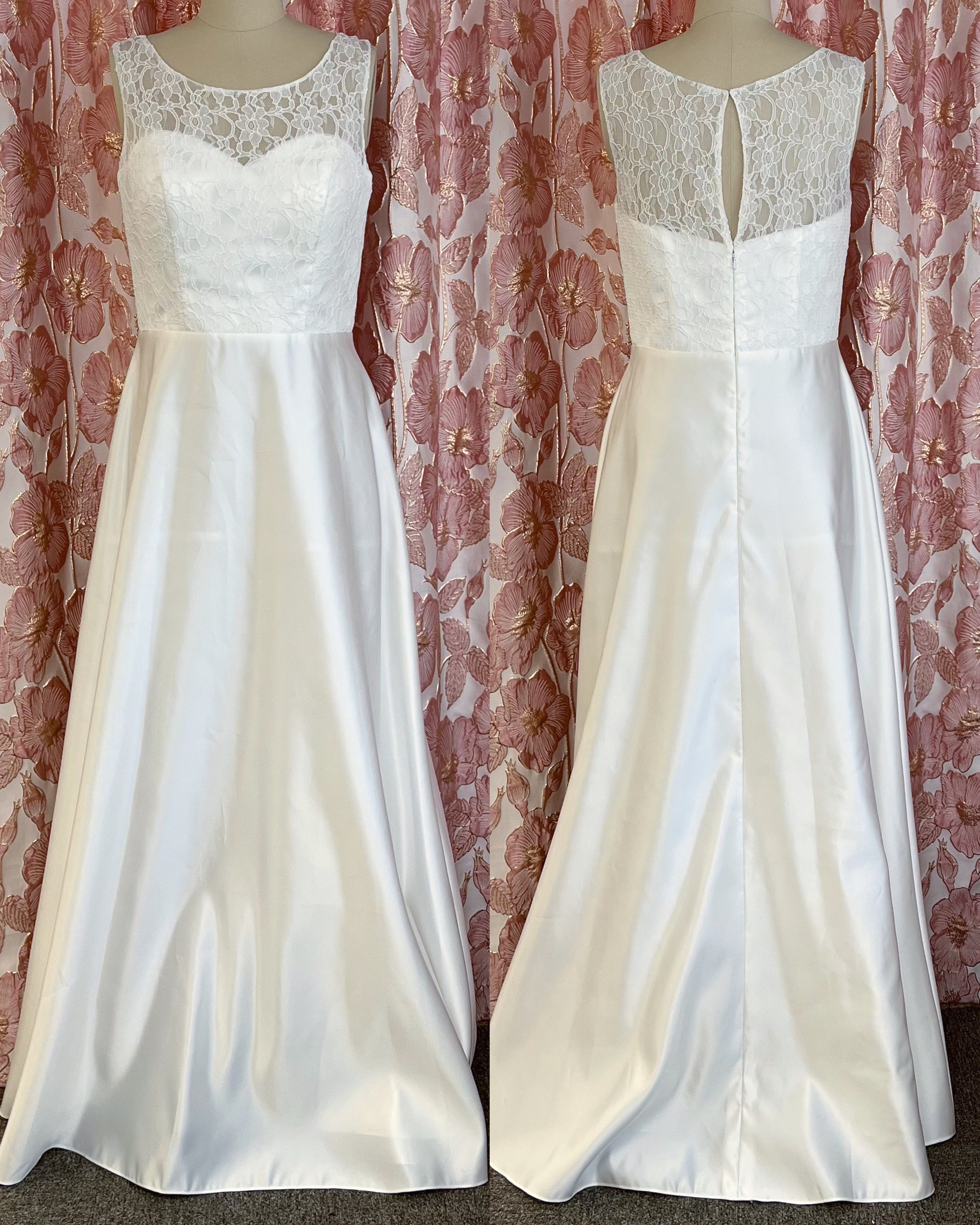 Satiinihelmainen laahuksellinen puku pitsiyläosalla jossa laskettu vyötärölinja. Sävy ivory.