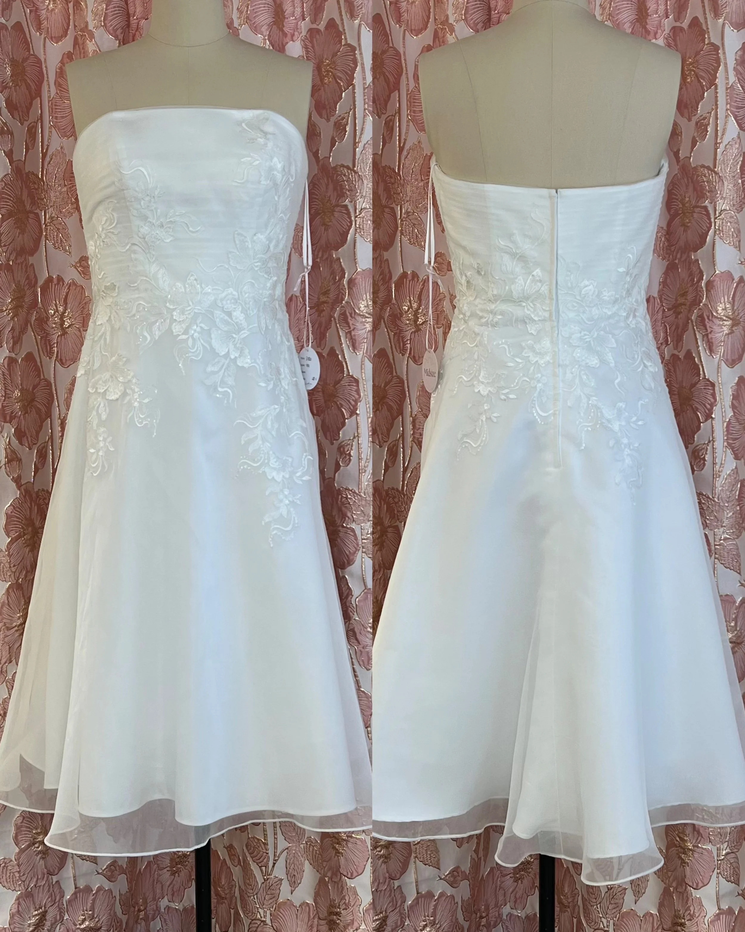 Lyhyt häämekko organzahelmalla ja pitsikoristellulla yläosalla. Sävy ivory.