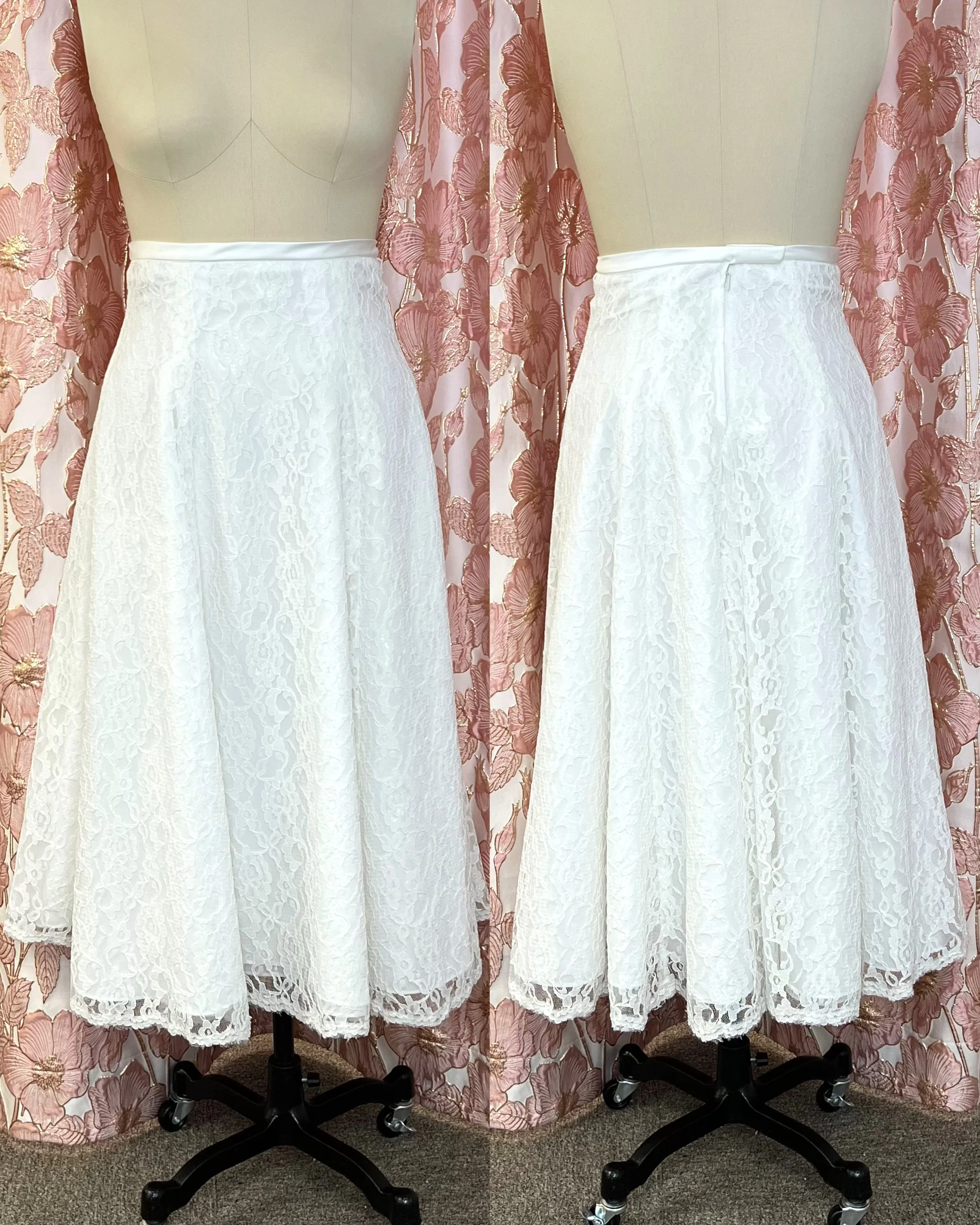 Midimittainen vuoritettu pitsihame. Sävy ivory.