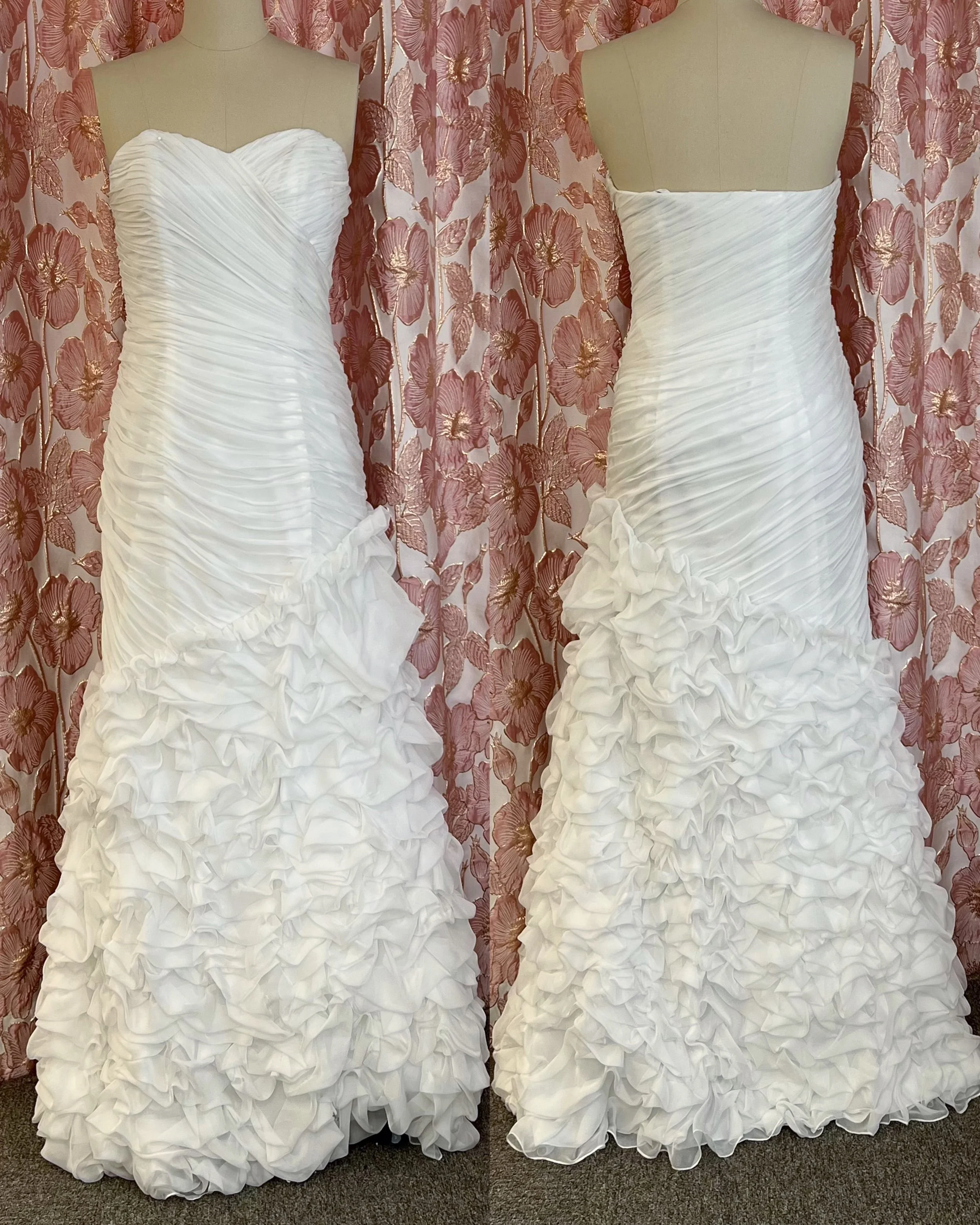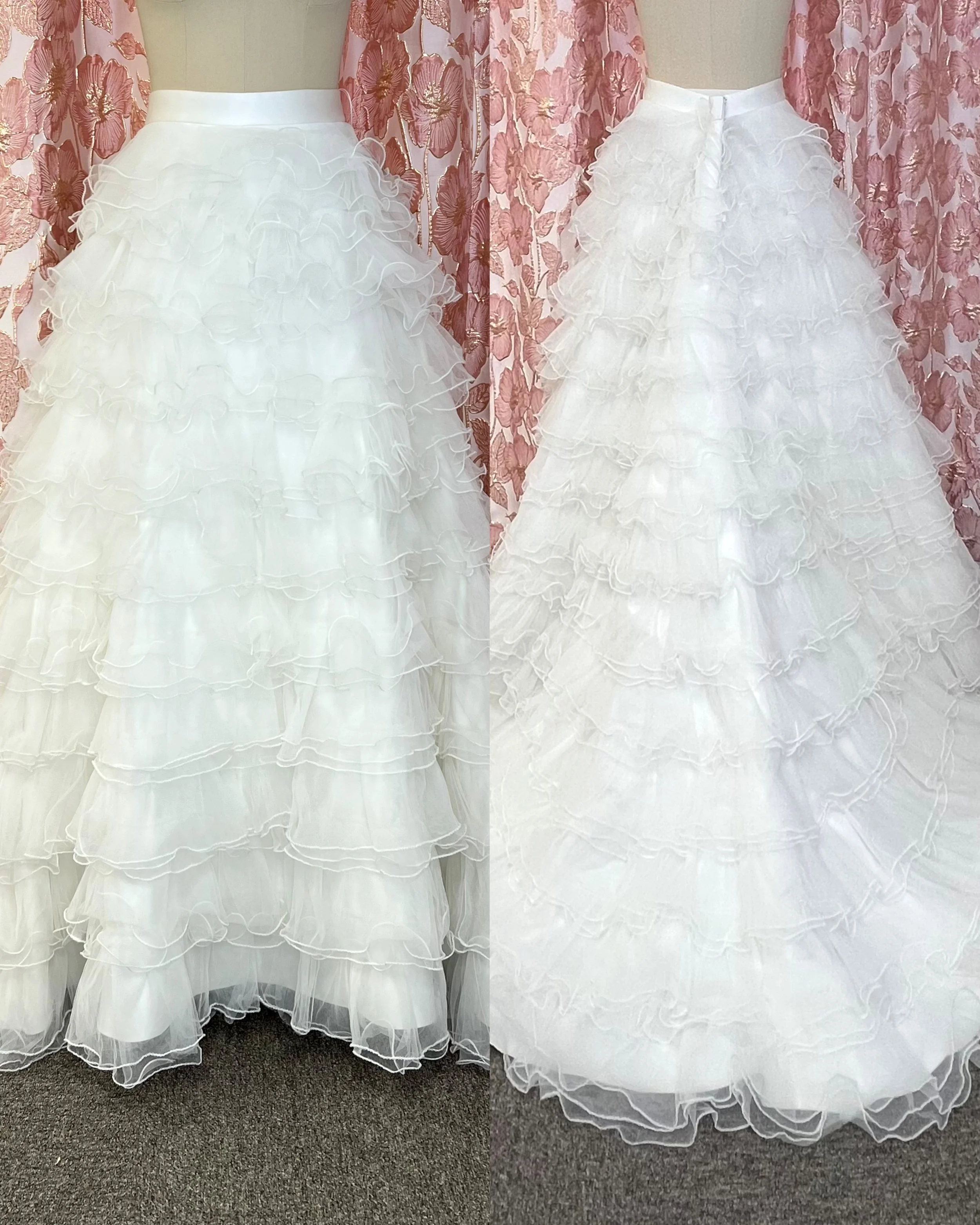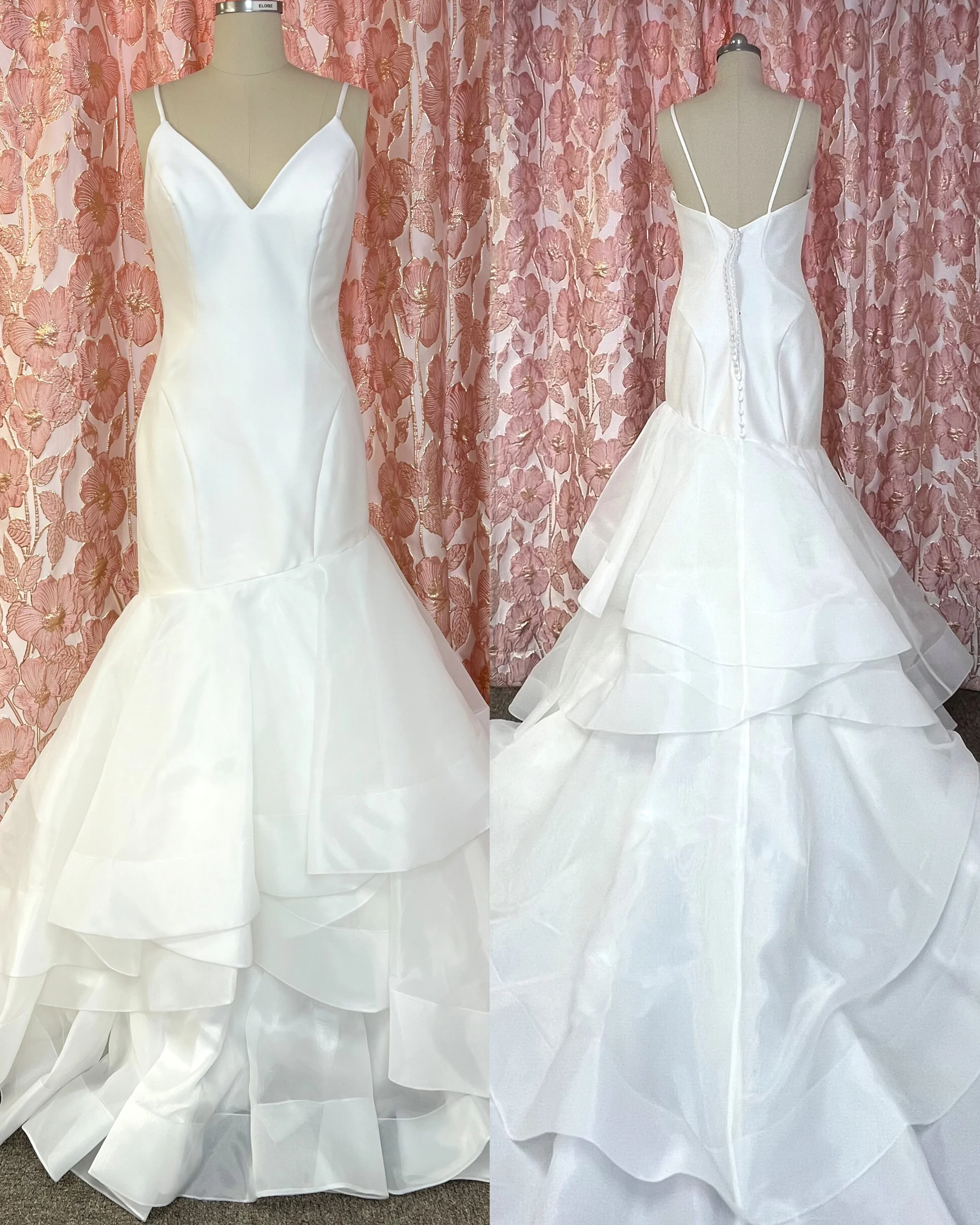 Mikadopuku organza-volankihelmalla ja pitkällä laahuksella. Puvun mukana tulee pukupussi. Sävy ivory.