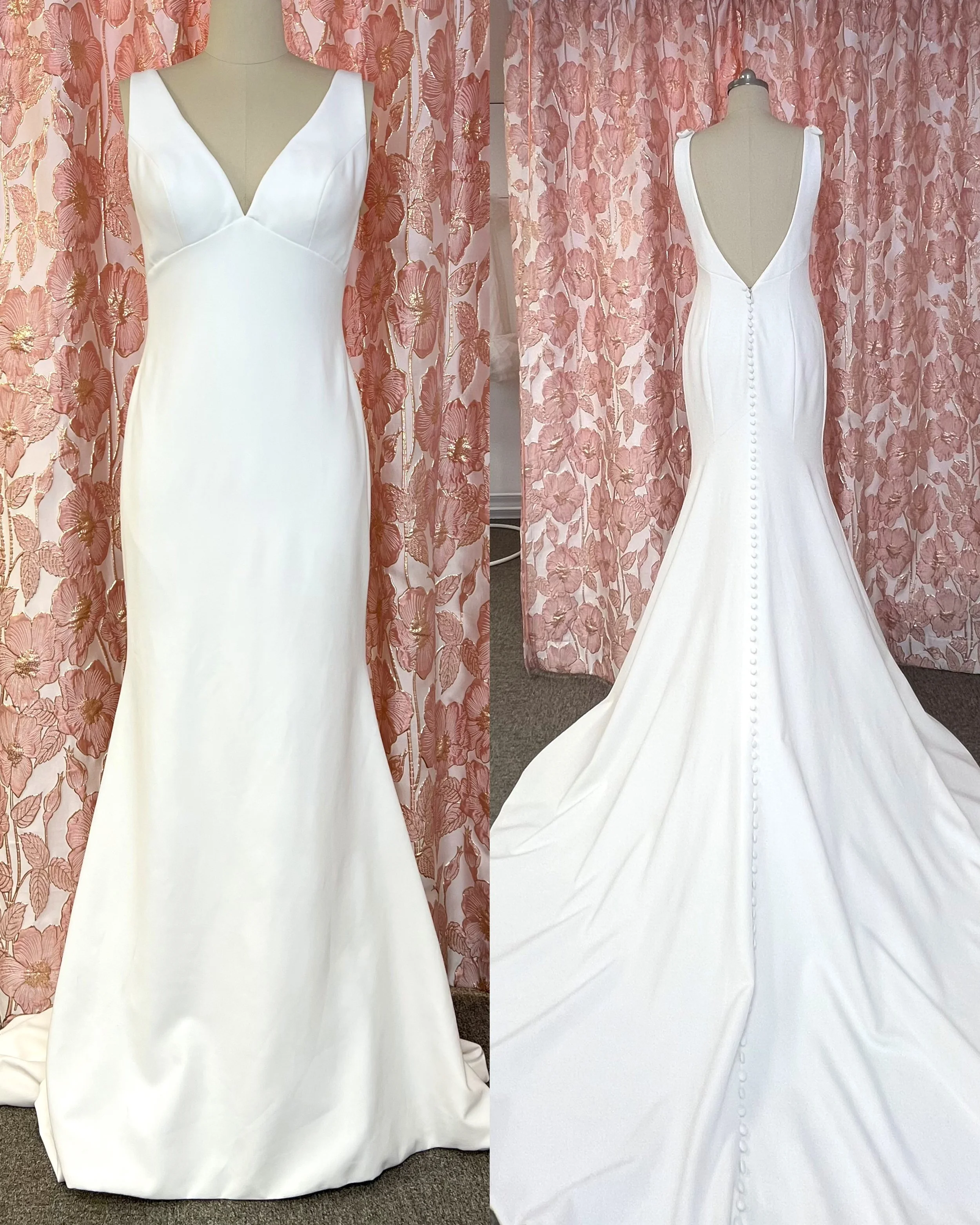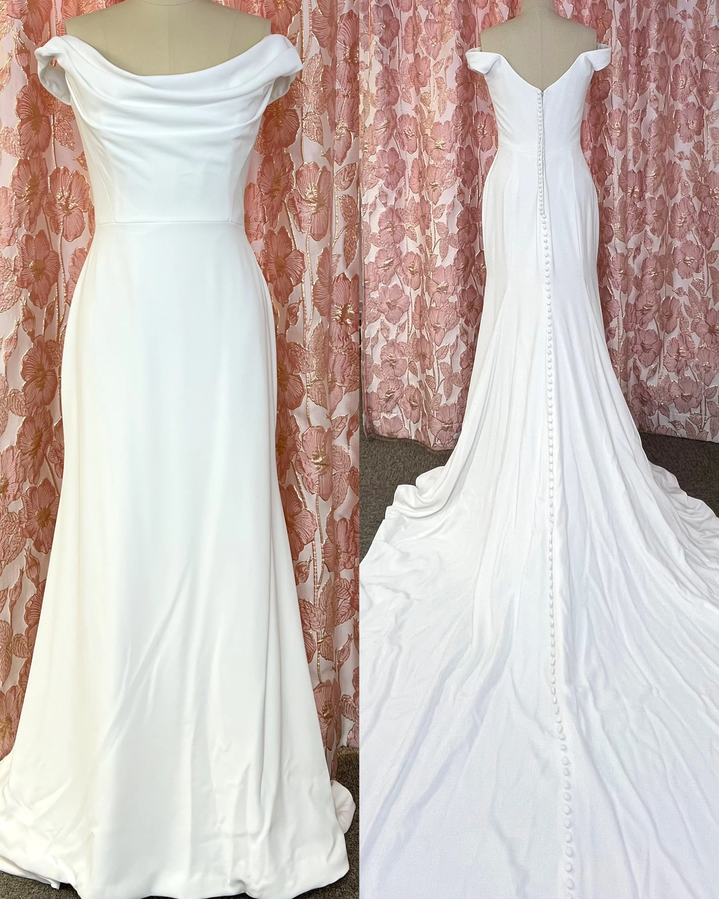 Kapea kreppipuku pitkällä laahuksella. Todella tuettu vedostettu yläosa jossa offshoulder-olkaimet. Puvun mukana tulee pukupussi. Sävy ivory
