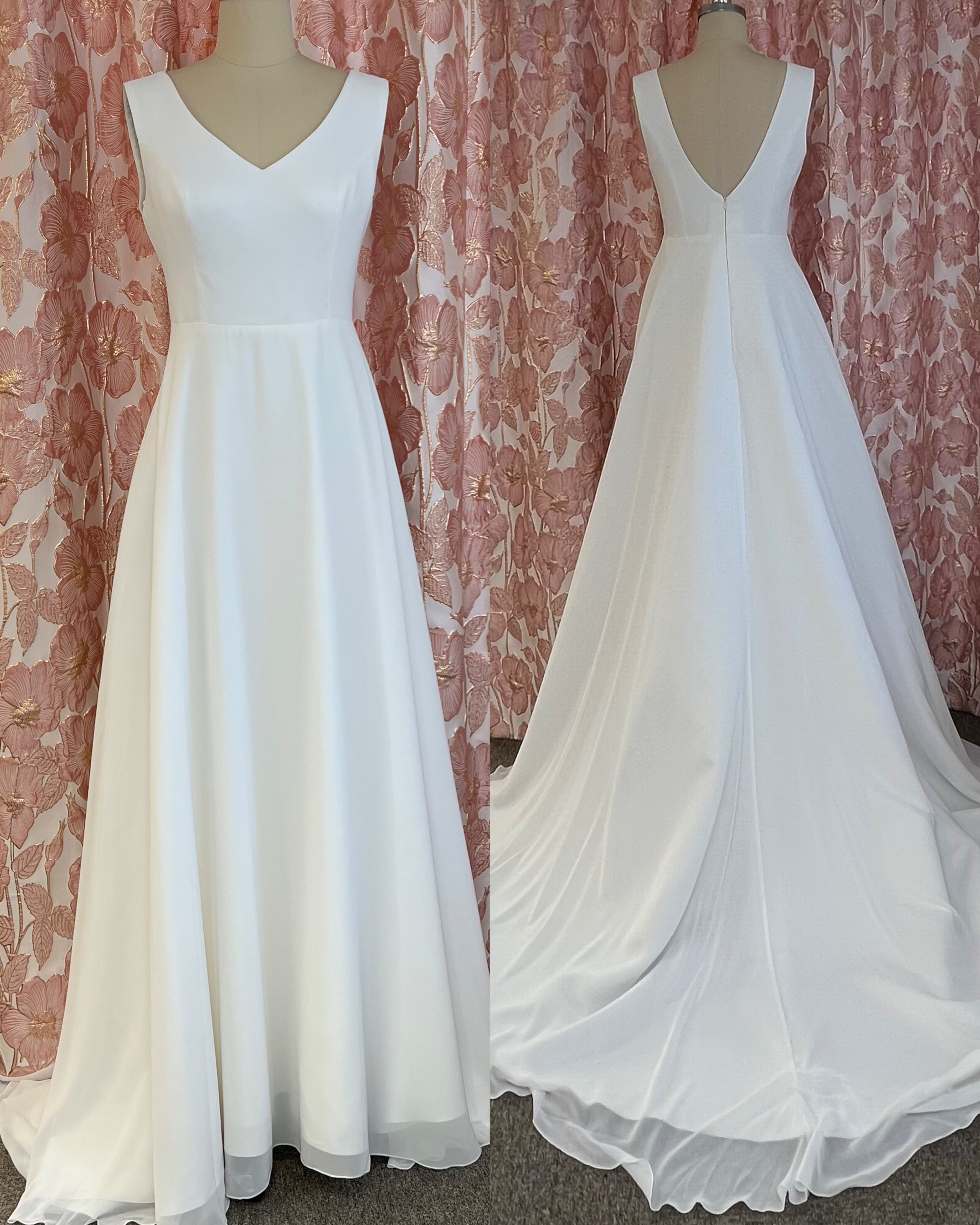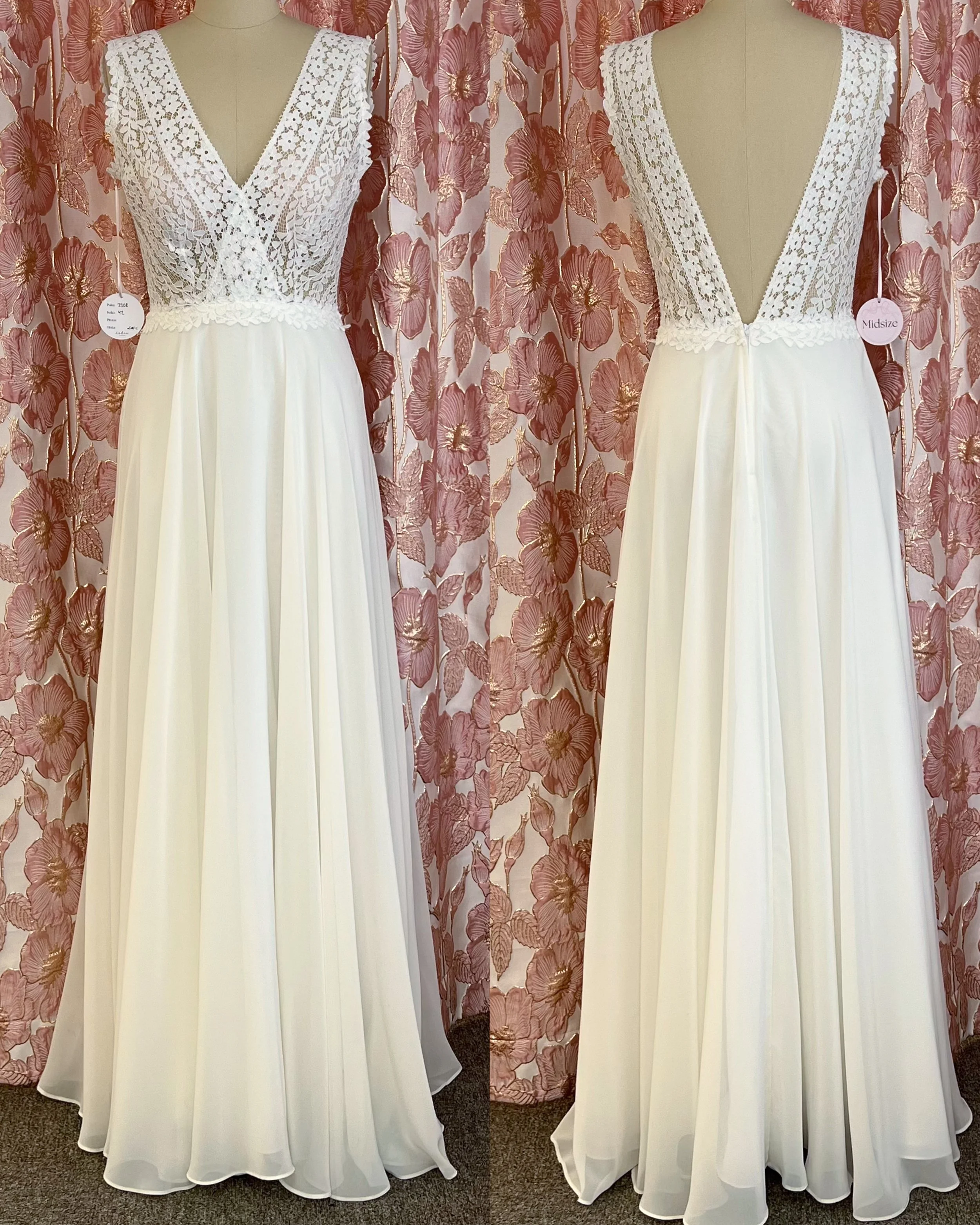 Kevyt sifonkihelmainen laahukseton hääpuku pitsiyläosalla. Sävy ivory.